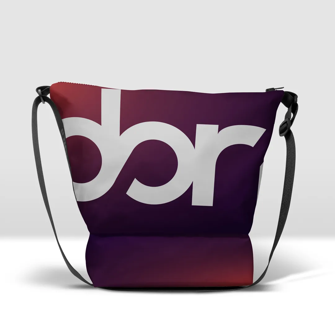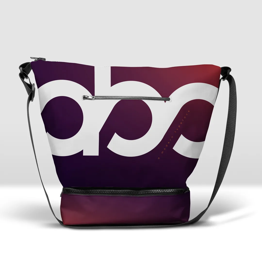 Stampata in banner PVC 560, tasca con zip pressofusa e base capiente separata da cerniera.
