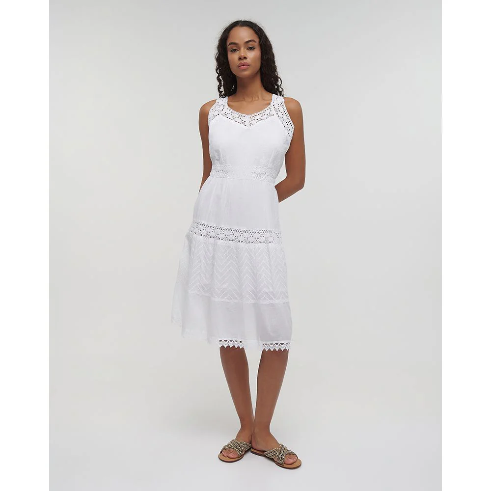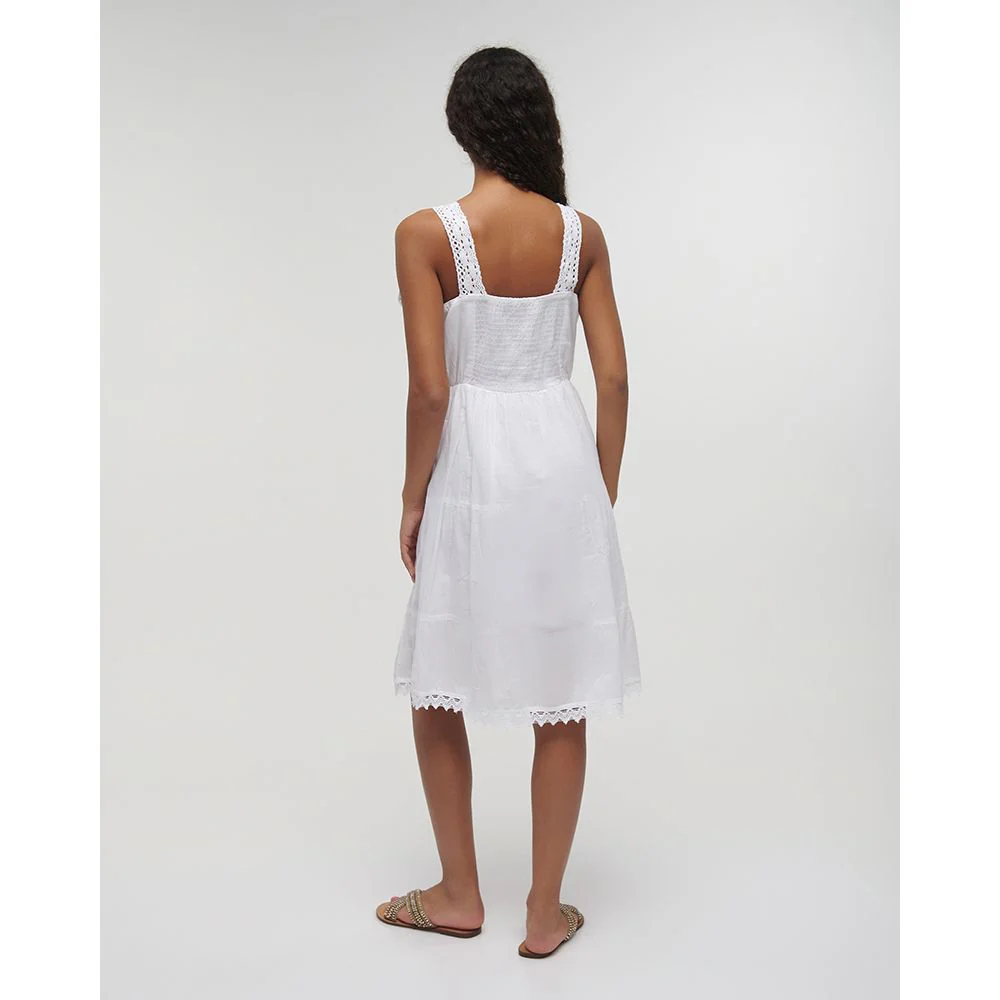 Abitino bianco totalmente in pizzo bianco con dettagli ricamati a mano sule spalle larghe e sulla scollatura a v. Un abito dolce ed elegante per tutte le occasione. COD 5-41-057-0151