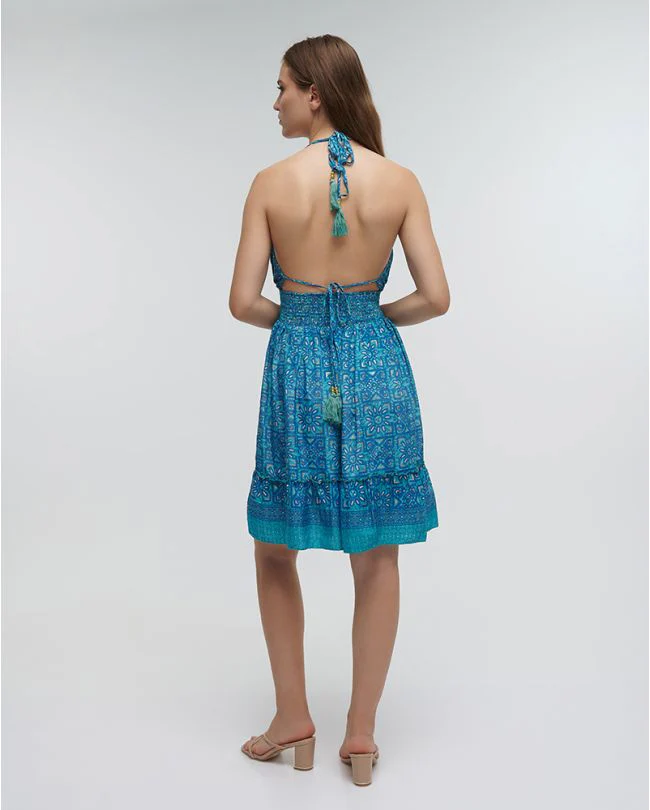Abito donna corto leggero e morbido in blu con dettagli dorati e allacciatura regolabile al collo con uno scollo a v e scollatura sulla schiena. COD 5-41-133-0015