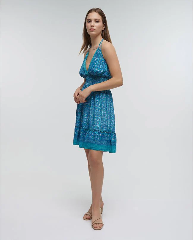Abito donna corto leggero e morbido in blu con dettagli dorati e allacciatura regolabile al collo con uno scollo a v e scollatura sulla schiena.