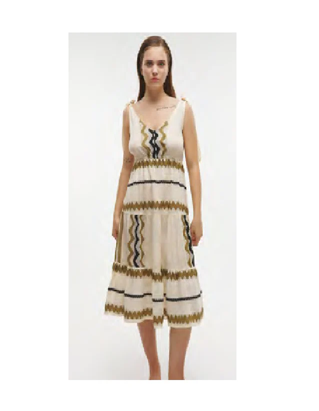 Abito donna corto con spalla larga e scollo a v, in lino per essere fresche anche nelle giornate piรน calde, di un panna che dona eleganza con dettagli geometrici blu e beige. COD. 5 41 346 0310