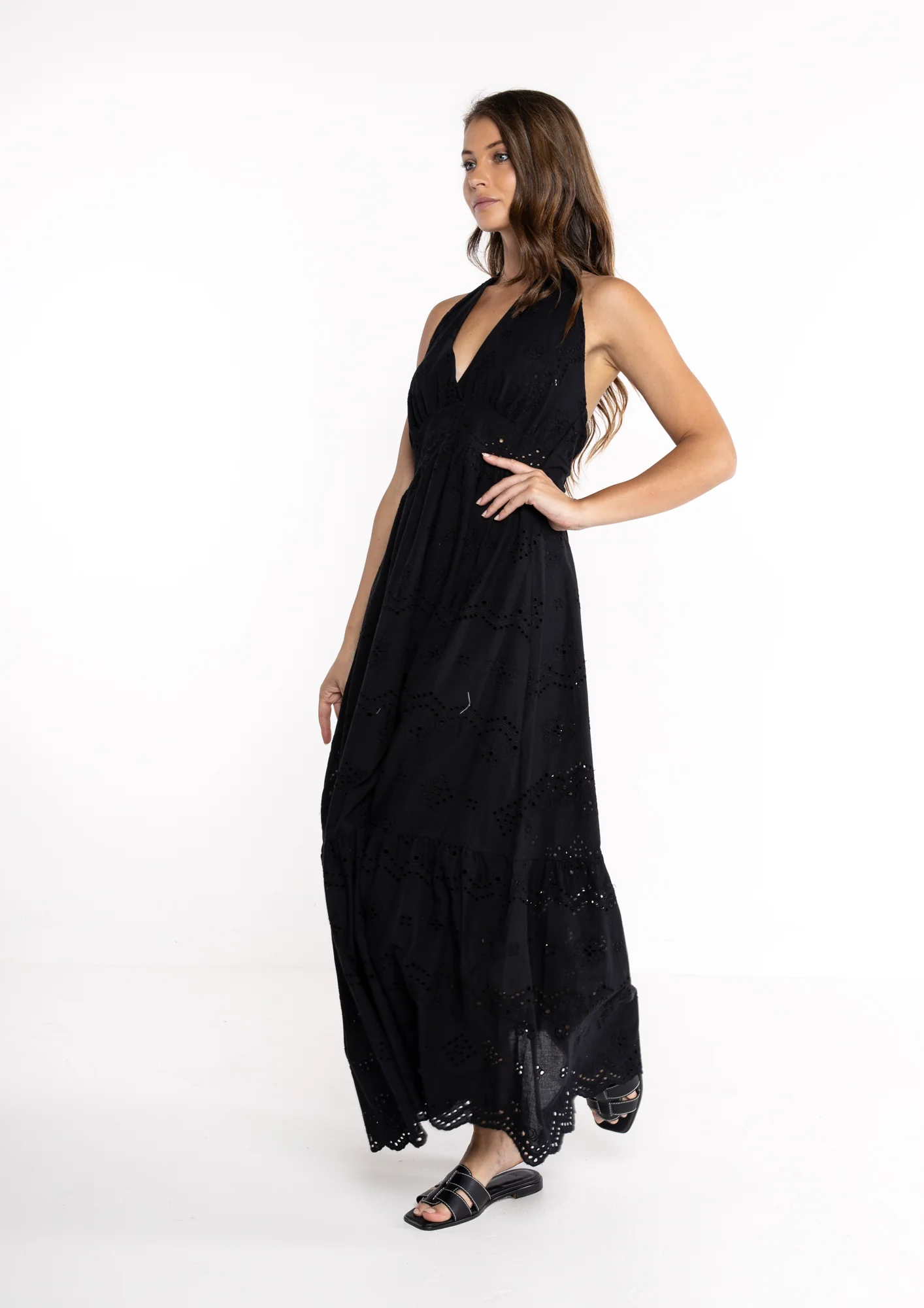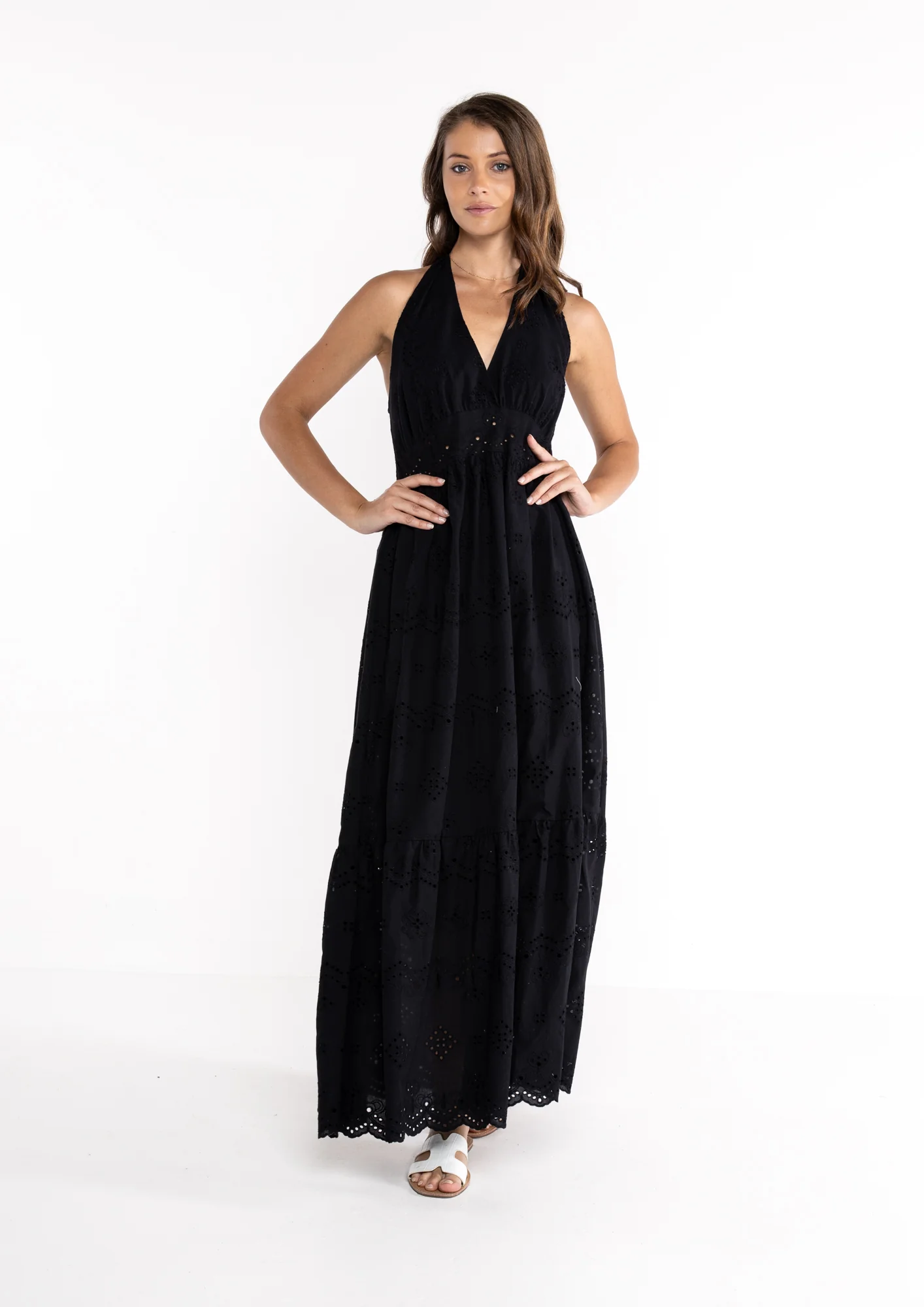 Abito elegante in pizzo sangallo nero con scollo all’americana, perfetto per l’estate. Questo capo della nuova collezione combina raffinatezza e comfort, ideale per occasioni speciali o look sofisticati da giorno. Il delicato pizzo sangallo regala trasparenze affascinanti, mentre la linea scollo all’americana valorizza le spalle. Un must-have versatile per la stagione estiva.