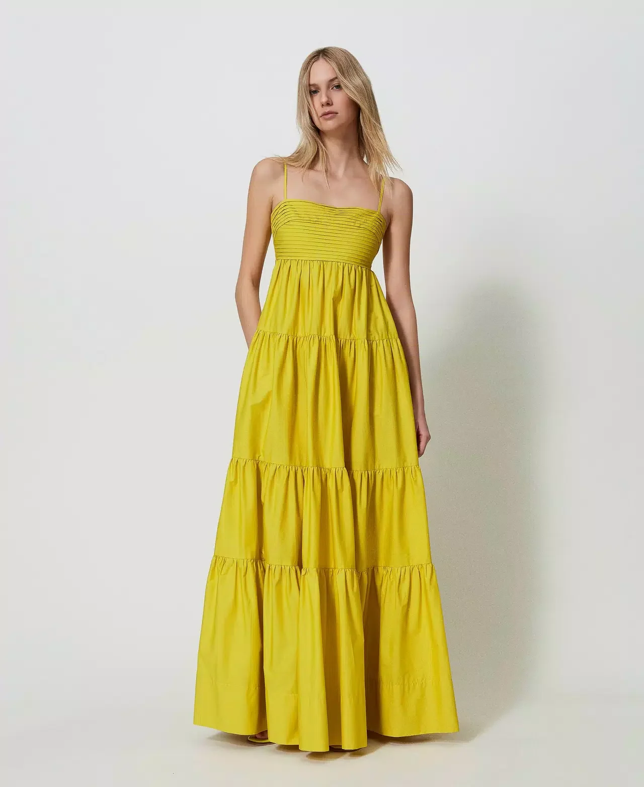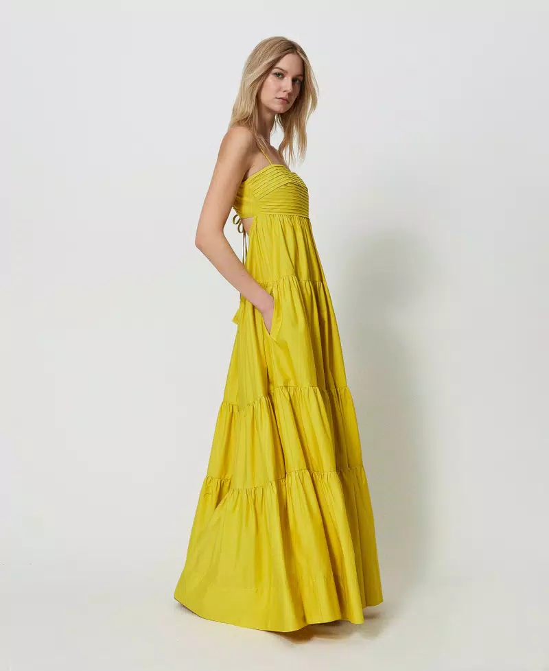 Vestito lungo giallo con balze e schiena nuda, perfetto per un look fresco e originale. Realizzato al 100% in cotone, con bretelline e laccetti regolabili dietro per una vestibilitร comoda e personalizzata. Aggiungi un tocco di colore al tuo guardaroba con questo abito donna Twinset!
