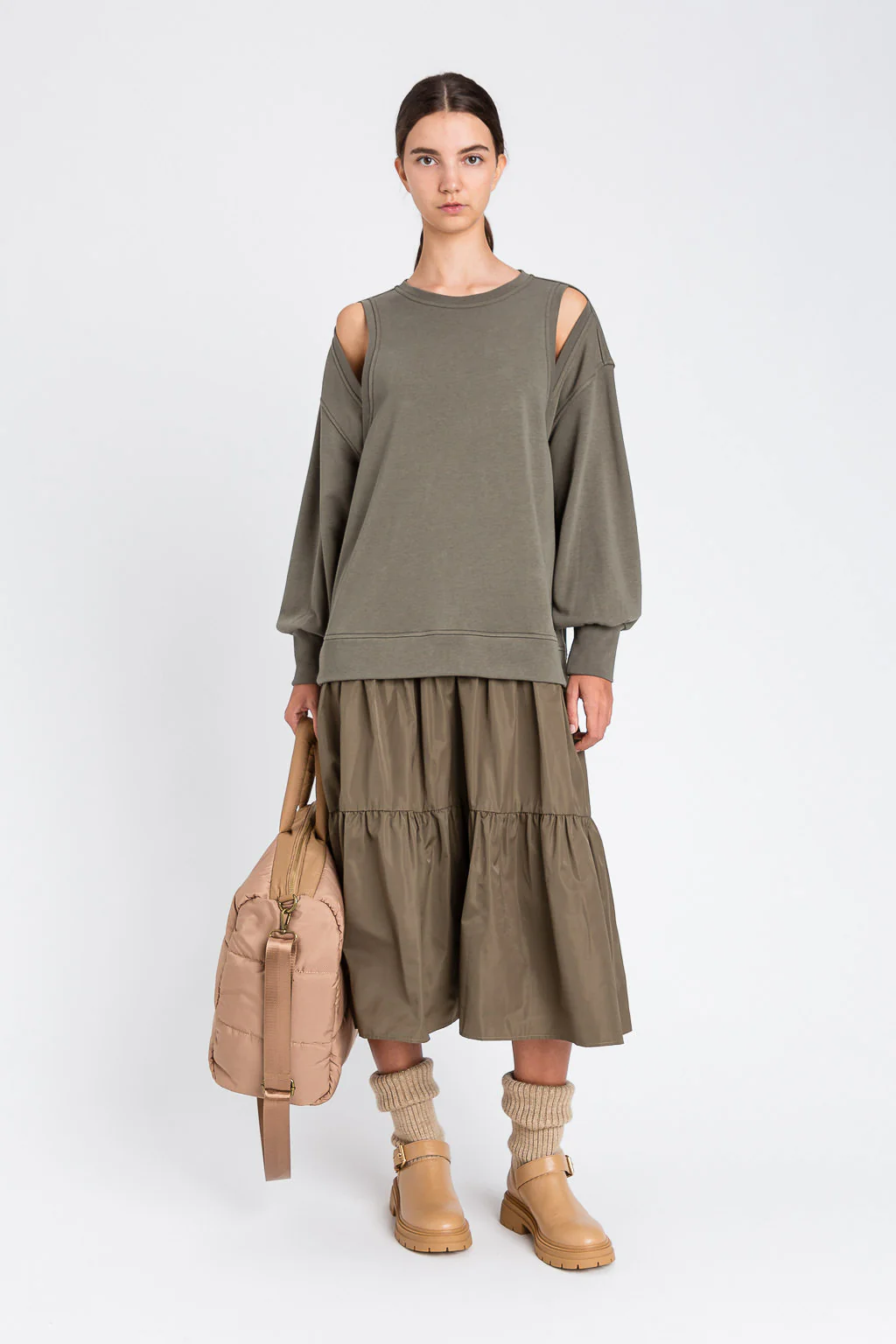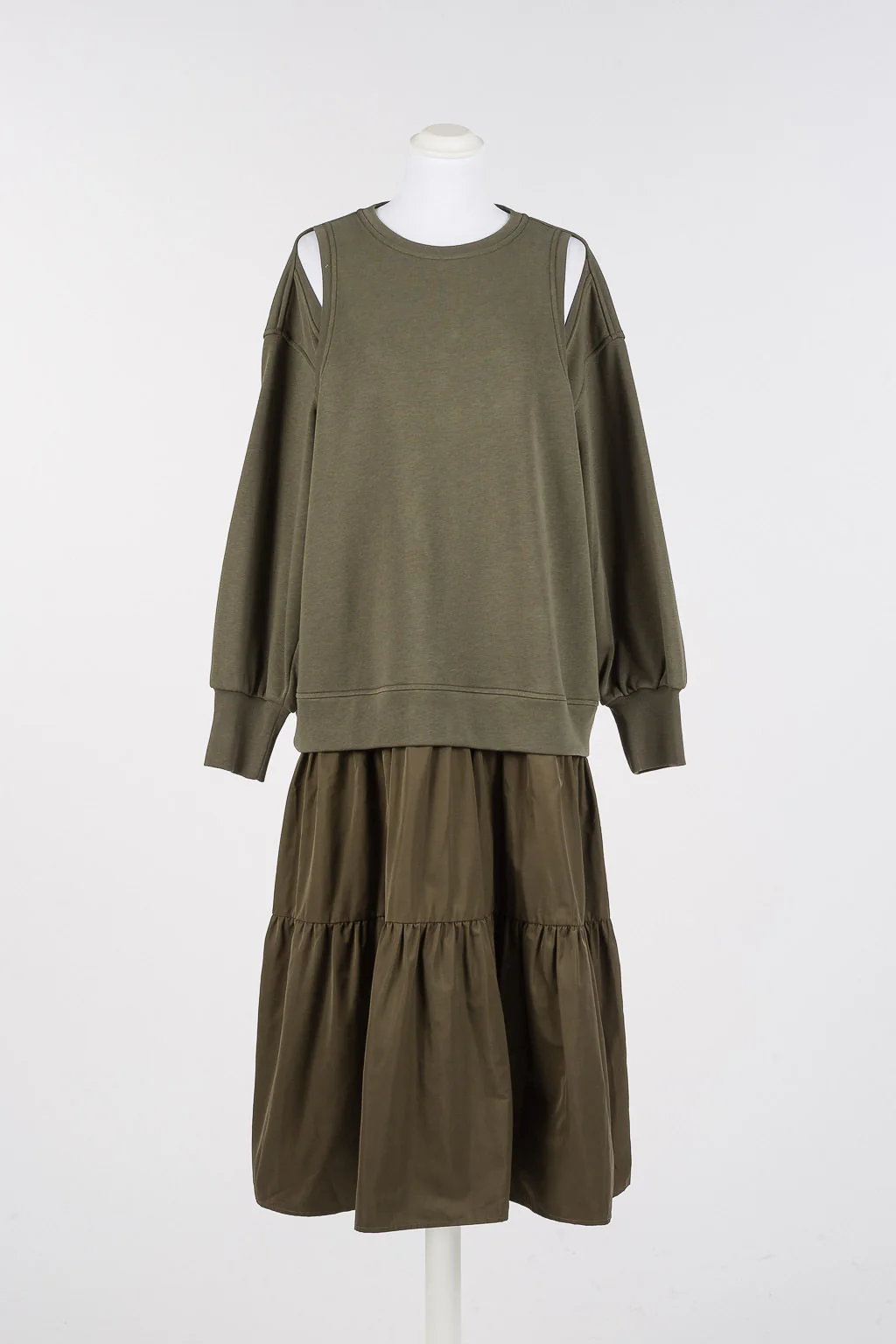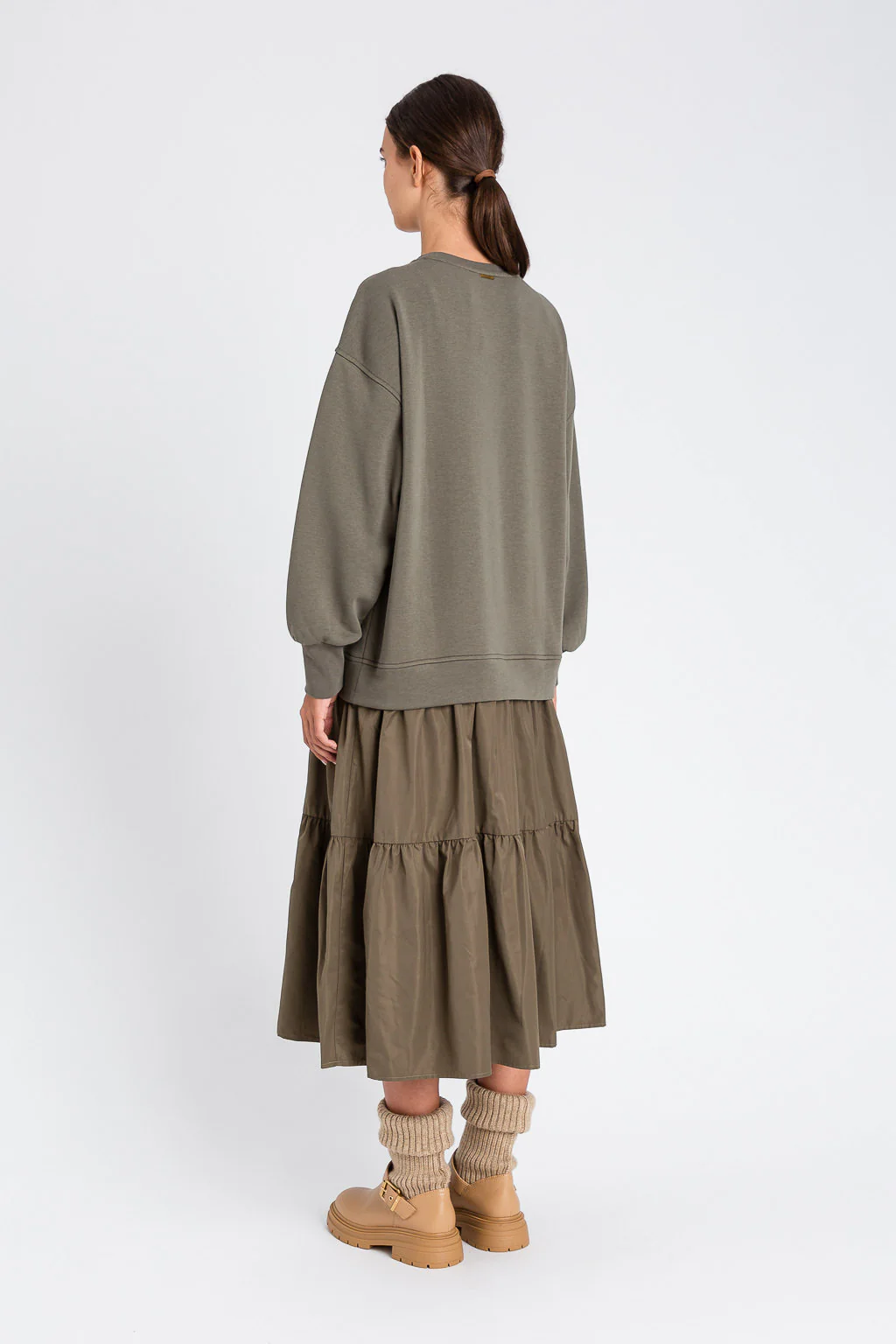 Questo abito lungo di Twinset unisce stile e comfort con un effetto doppio capo, realizzato in felpa di cotone e taffetร . Il collo tondo e le spalle con cut-out donano un tocco contemporaneo, mentre le maniche lunghe con polsi in costina aggiungono dettagli eleganti. La gonna a balze, la linea morbida e la placchetta logo in metallo sul retro completano un design sofisticato, ideale per chi cerca una proposta di classe e originalitร  in ogni occasione.
