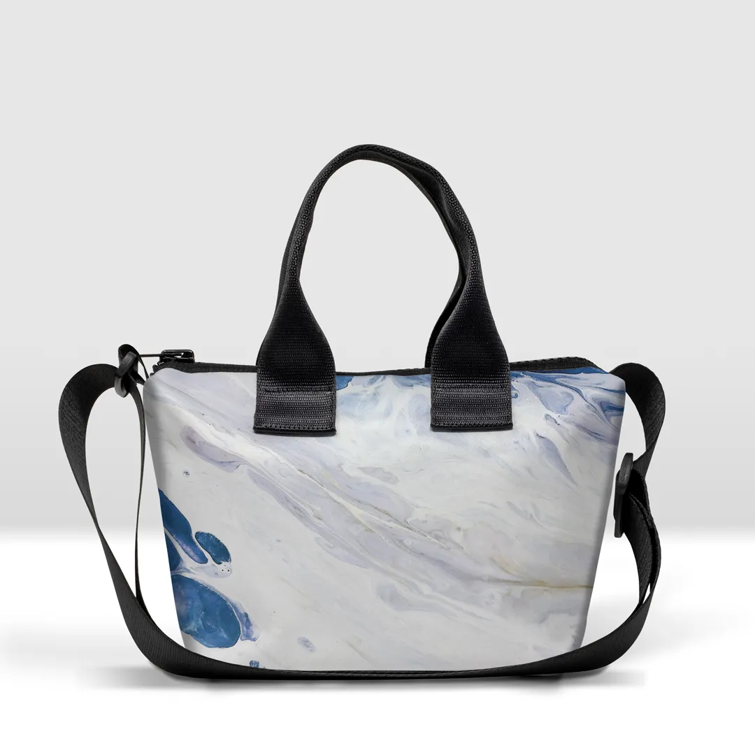 Borsa in banner PVC stampato, zip esterna pressofusa con bordo in tessuto, taschino interno con zip pressofusa, imbottita sul fondo e con possibilità di aggiungere una tracolla. Cinghia prodotta con cintura di sicurezza, brandizzata con incisione laser.