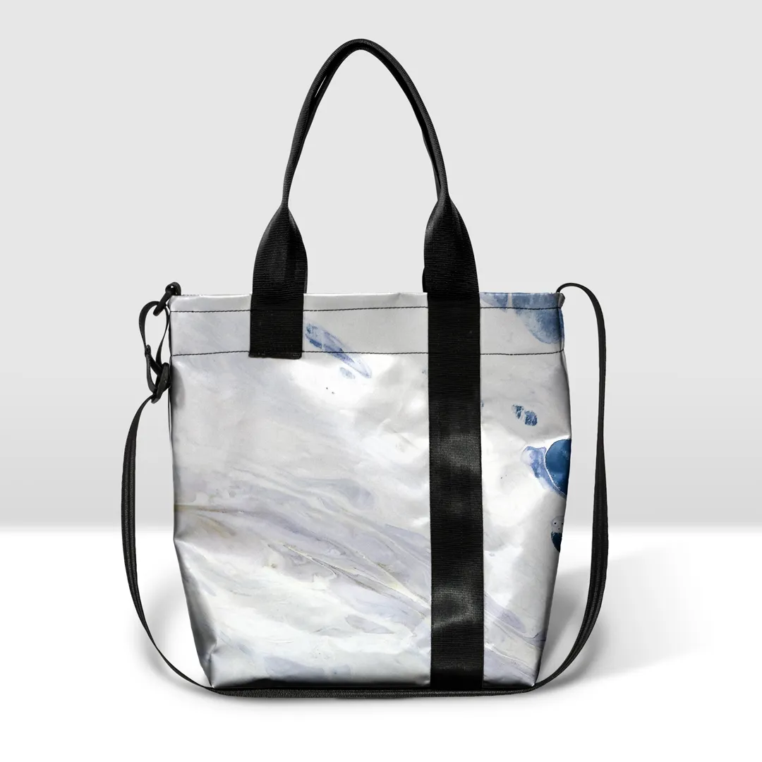 Borsa in banner PVC stampato, con zip pressofusa divisibile e tasca interna.