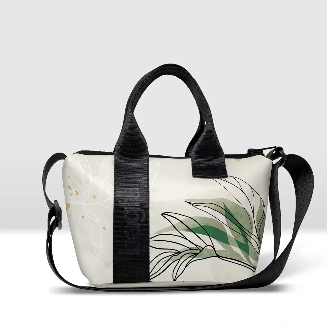 Borsa in banner PVC stampato, zip esterna pressofusa con bordo in tessuto, taschino interno con zip pressofusa, imbottita sul fondo e con possibilità di aggiungere una tracolla. Cinghia prodotta con cintura di sicurezza, brandizzata con incisione laser.