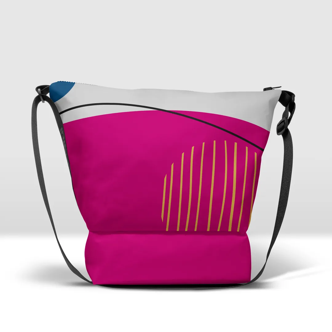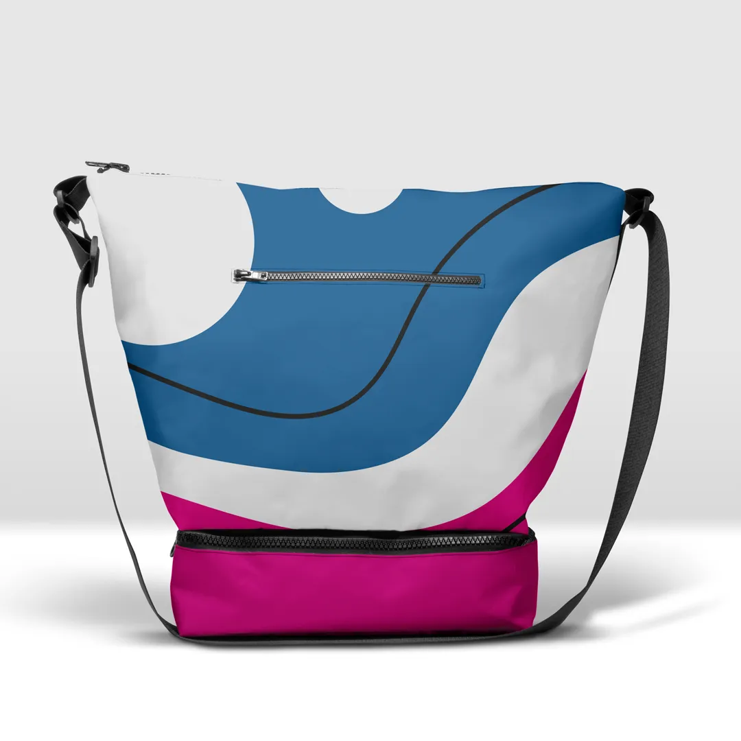 Stampata in banner PVC 560, tasca con zip pressofusa e base capiente separata da cerniera.