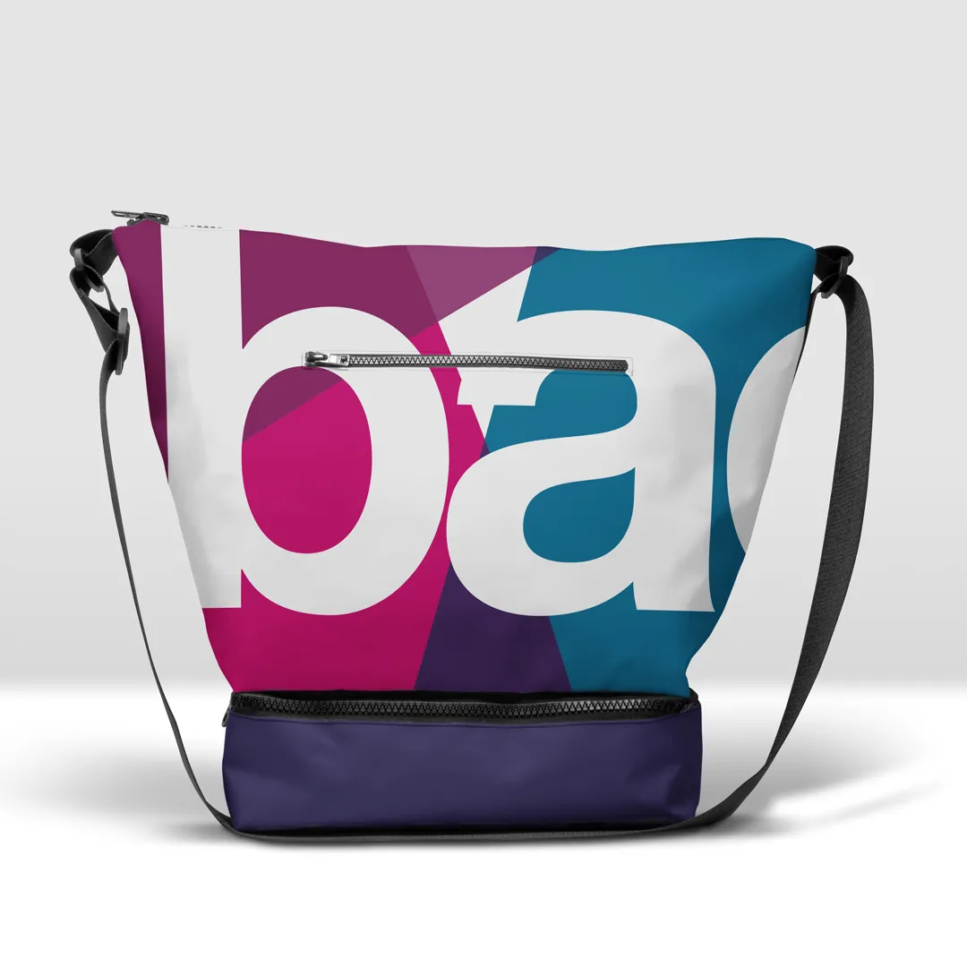 Stampata in banner PVC 560, tasca con zip pressofusa e base capiente separata da cerniera.