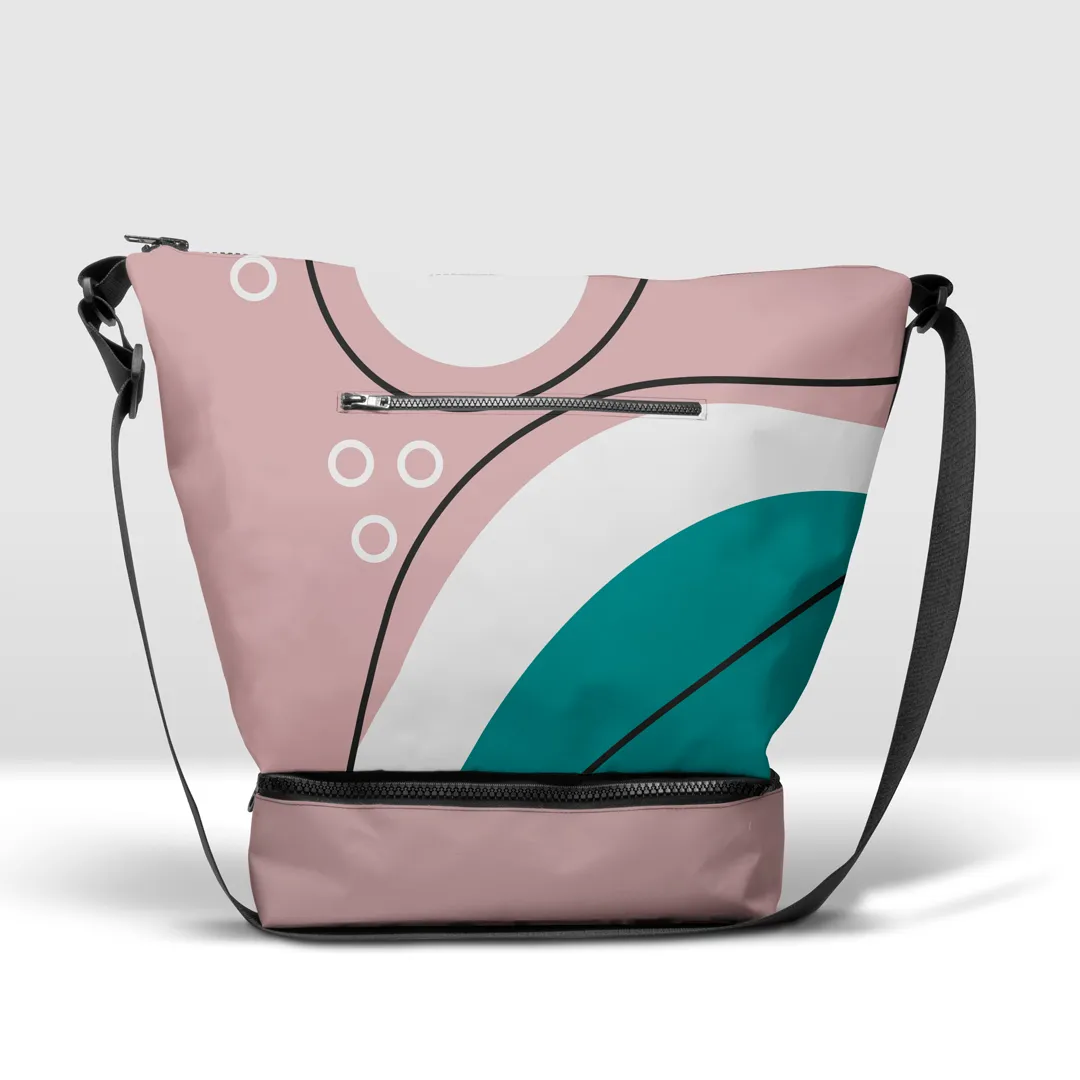Stampata in banner PVC 560, tasca con zip pressofusa e base capiente separata da cerniera.