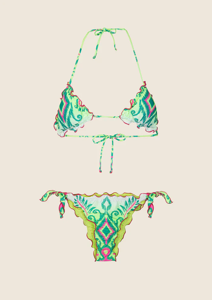 Questo bikini Effek รจ ideale per le giornate al mare o in piscina. Il reggiseno a triangolo offre un sostegno regolabile e il design a fantasia rende il capo unico e alla moda. Inoltre, grazie all’imbottitura interna estraibile e ai bordi arricciati, ti sentirai comoda e femminile in ogni momento.