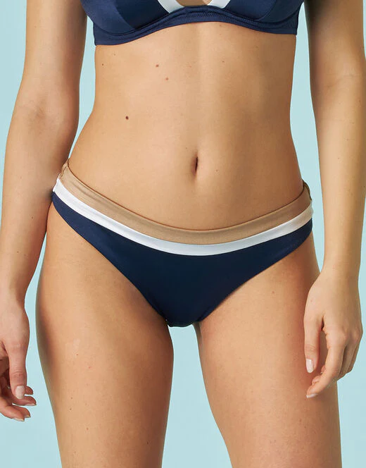 CON UNITO Elegante e comodo, il Costume Slip Midi Shiny Colour Block รจ la scelta ideale per un look mare raffinato. Realizzato in microfibra morbida e traspirante, questo slip blu รจ caratterizzato da un girovita in contrasto colore bianco e bronzo, che dona un tocco di eleganza e modernitร al design. Il taglio midi offre una vestibilitร pratica e confortevole, perfetta per ogni tipo di fisico.