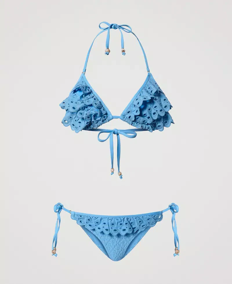 Cattura l’attenzione al mare con il bikini Twinset in pizzo sangallo, colore celeste. Slip con laccetti e triangolo con imbottitura estraibile per garantirti il massimo comfort. Aggiungi un tocco di femminilitร  al tuo look con questo bikini unico in puro stile Twinset.