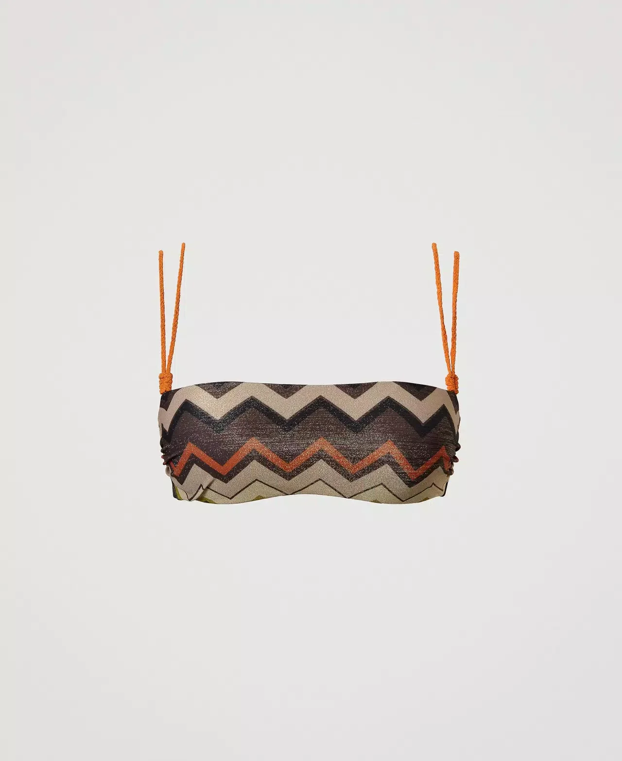 Aggiungi un po ‘di brillantezza alla tua estate con il bikini a fascia Twinset. Il tessuto in lurex nelle tonalitร dell’arancio, marrone e oro cattura la luce del sole, mentre i laccetti regolabili sul slip ti permettono di trovare la vestibilitร perfetta. Non vedrai l’ora di andare in spiaggia con questo bikini unico!