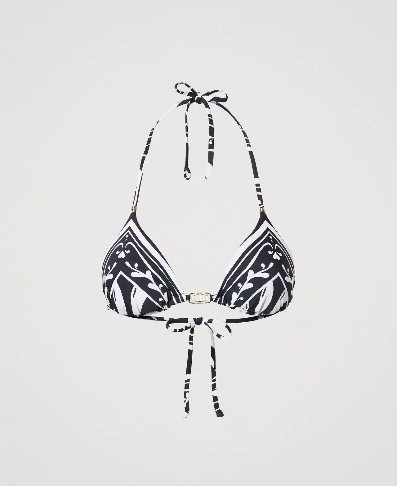 Il bikini donna Twinset 251LMMX22 presenta un triangolo da bagno con stampa foulard esclusiva Twinset, impreziosito dal logo centrale Oval T in metallo dorato con smalto colorato. Imbottito con coppe estraibili per una vestibilitร personalizzata, รจ dotato di laccetti versatili che si possono annodare dietro al collo o trasformare in spalline grazie alle asole alle estremitร . La fodera a tinta unita garantisce comfort e durata, unendo stile raffinato e funzionalitร . Triangolo abbinato ad uno slip fisso.