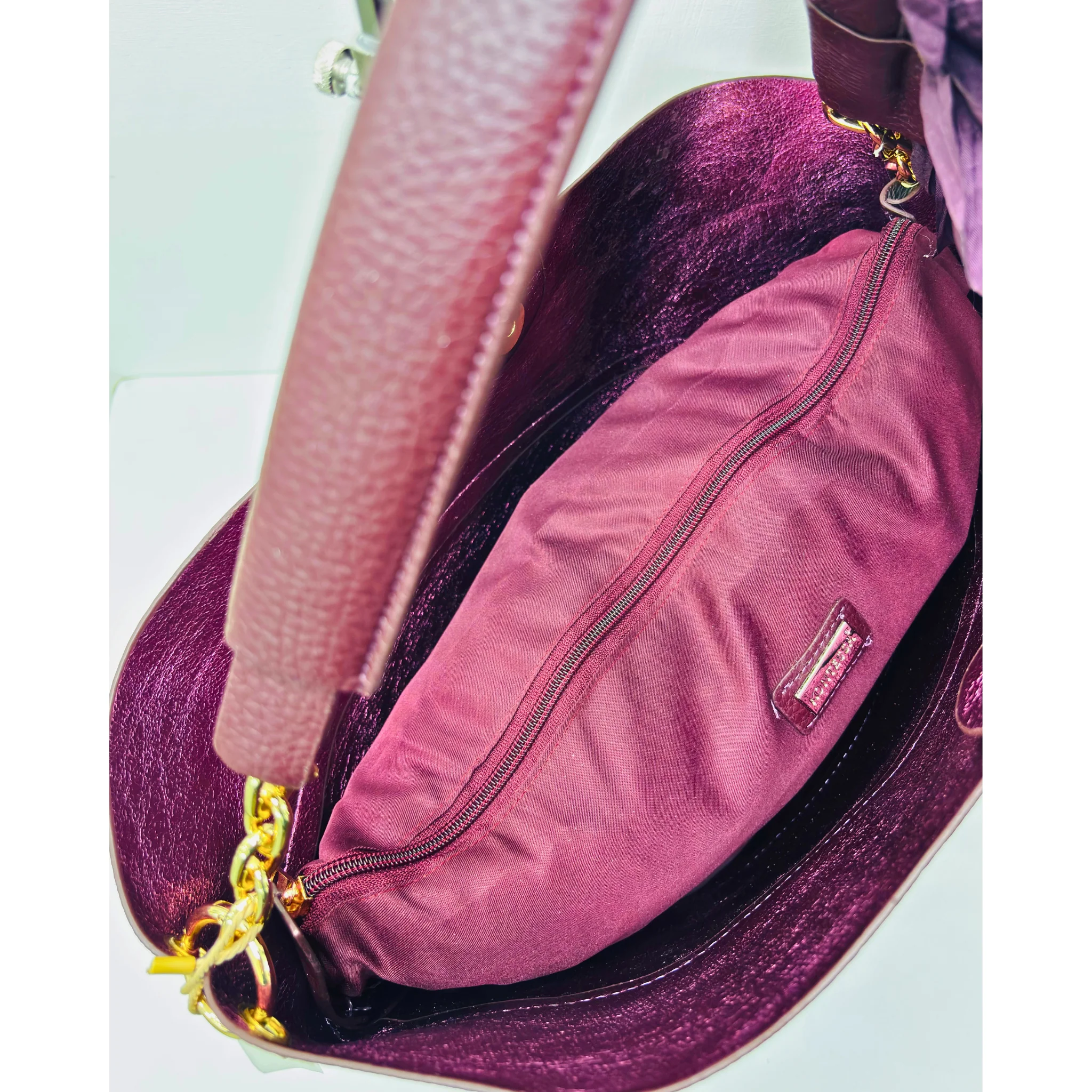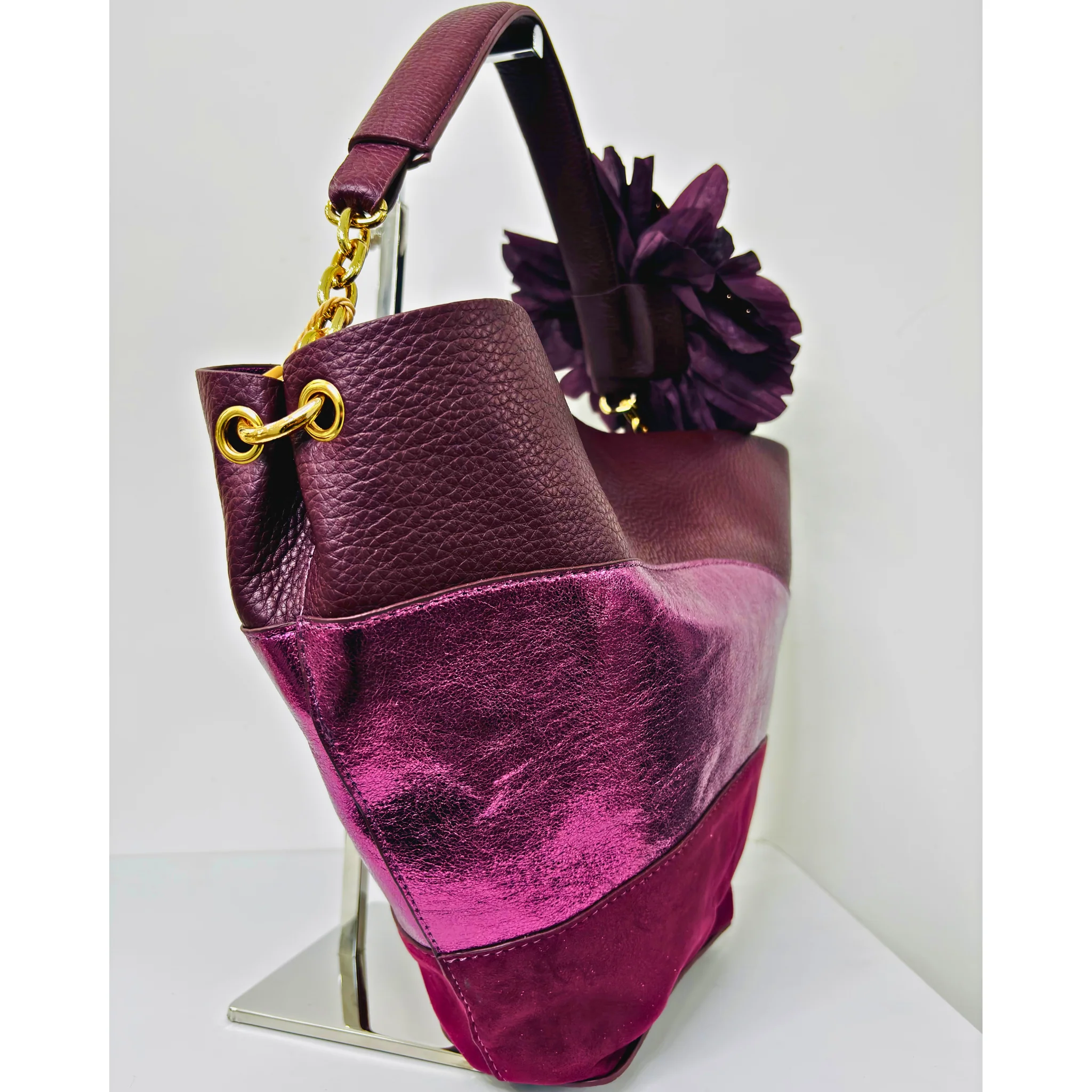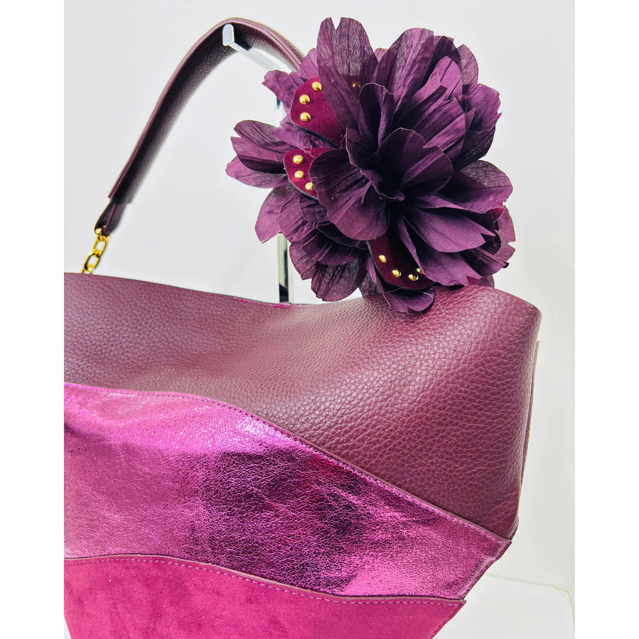 Borsa Kontessa realizzata in ecopelle di alta qualità, alternata a laminato e camoscio, per un look elegante e versatile. Con applicazione sul manico e tracolla removibile, è l’accessorio perfetto per ogni occasione. Aggiungi stile e funzionalità al tuo outfit con la Borsa Kontessa.