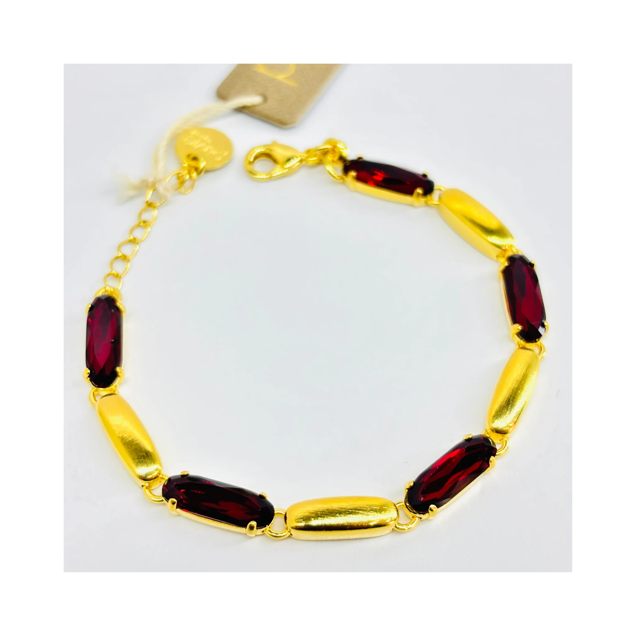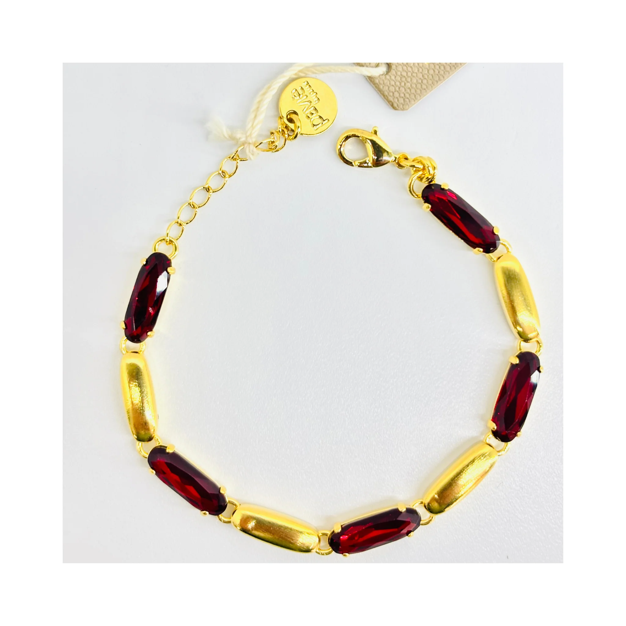 Bracciale Paviè realizzato con inserti in metallo satinato colore oro e pietre swaroski bordeaux, lunghezza massima 25 cm.