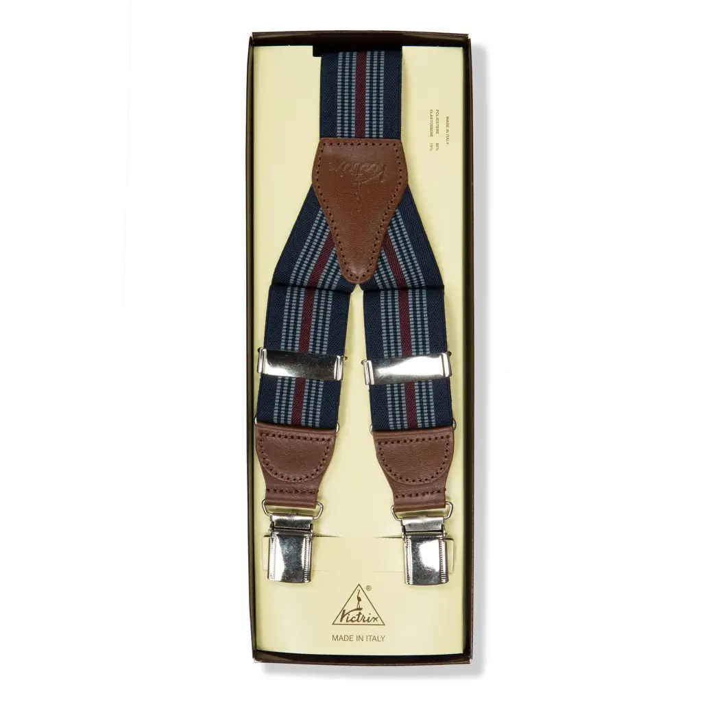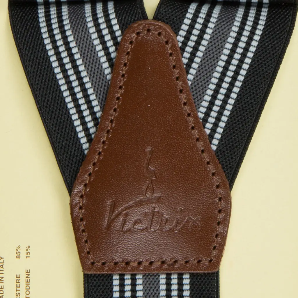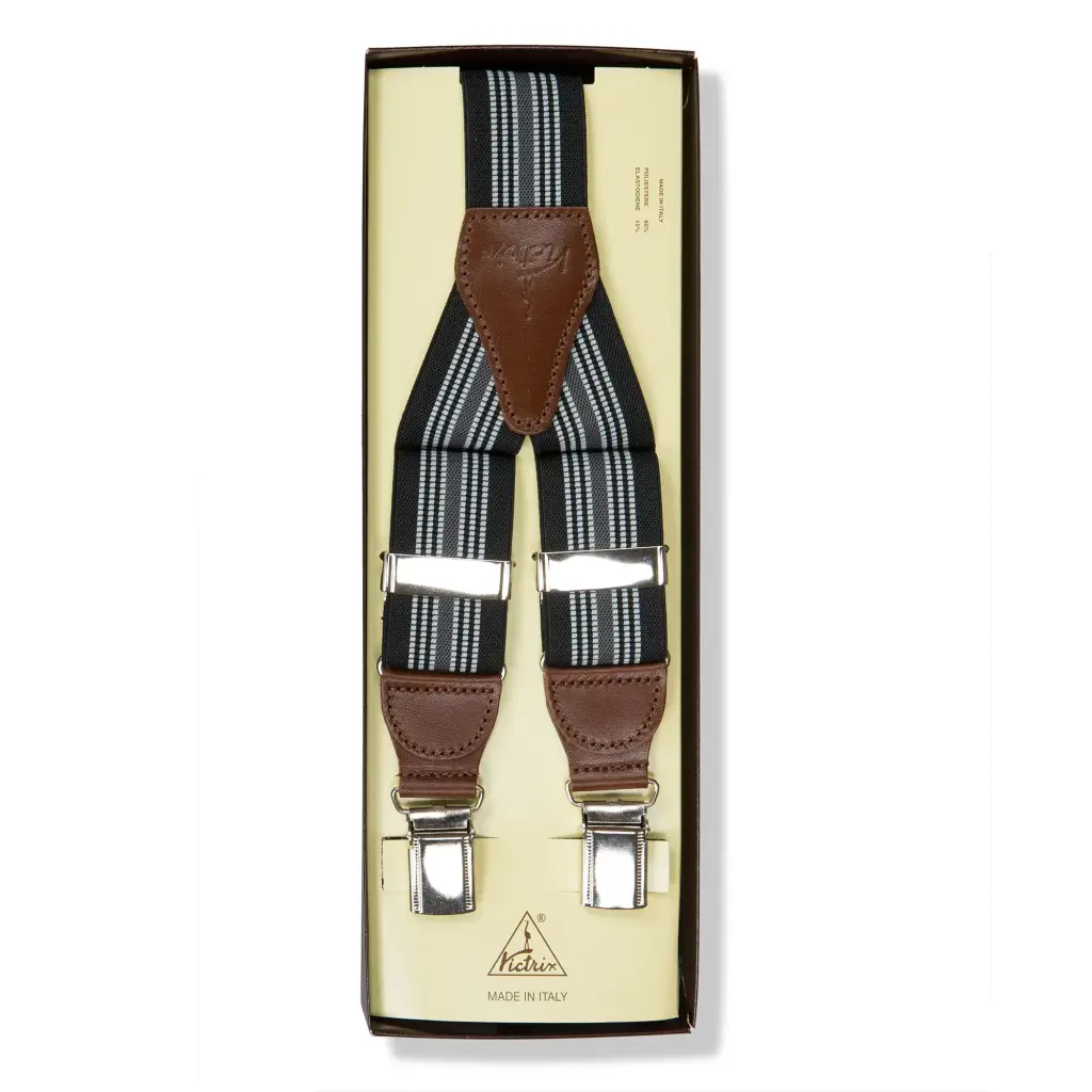 Bretelle uomo in tessuto elasticizzato con clip di fissaggio al pantalone di Victrix. Le bretelle sono un accessorio di tendenza ed allo stesso tempo funzionale. Questo modello è molto elegante e funzionale. Le bretelle sono realizzate con un’interessante fantasia di righe in tono su tono. Tutte le rifiniture sono in pelle e donano eleganza e un tocco distintivo al look. Disponibili in 4 colori sempre di tendenza si prestano a molti abbinamenti.