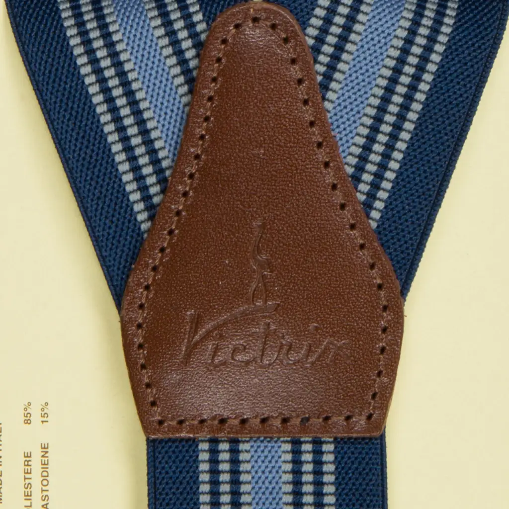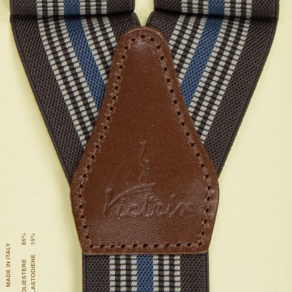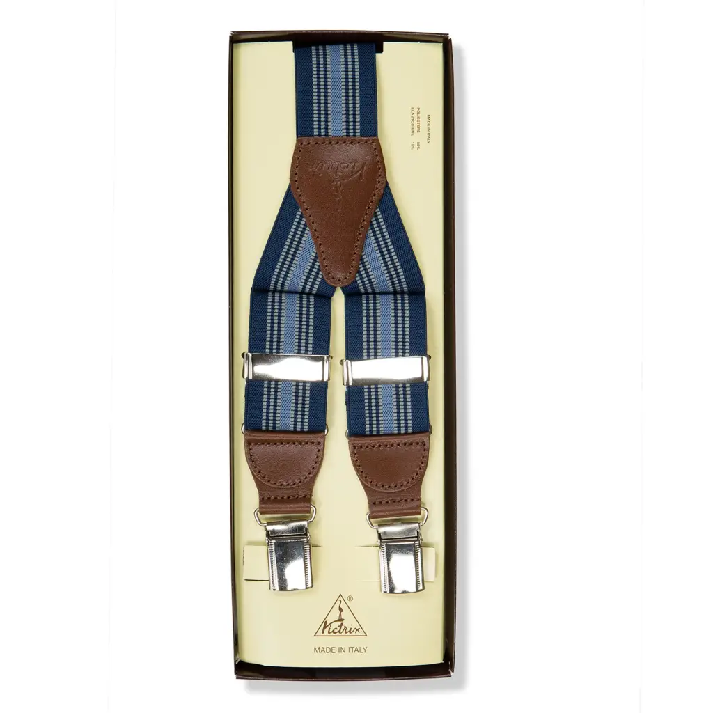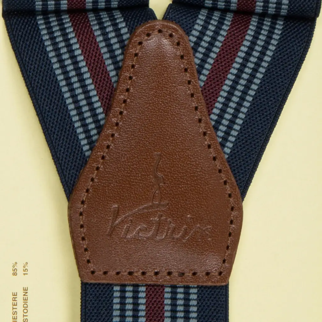 Bretelle uomo in tessuto elasticizzato con clip di fissaggio al pantalone di Victrix. Le bretelle sono un accessorio di tendenza ed allo stesso tempo funzionale. Questo modello è molto elegante e funzionale. Le bretelle sono realizzate con un’interessante fantasia di righe in tono su tono. Tutte le rifiniture sono in pelle e donano eleganza e un tocco distintivo al look. Disponibili in 4 colori sempre di tendenza si prestano a molti abbinamenti.