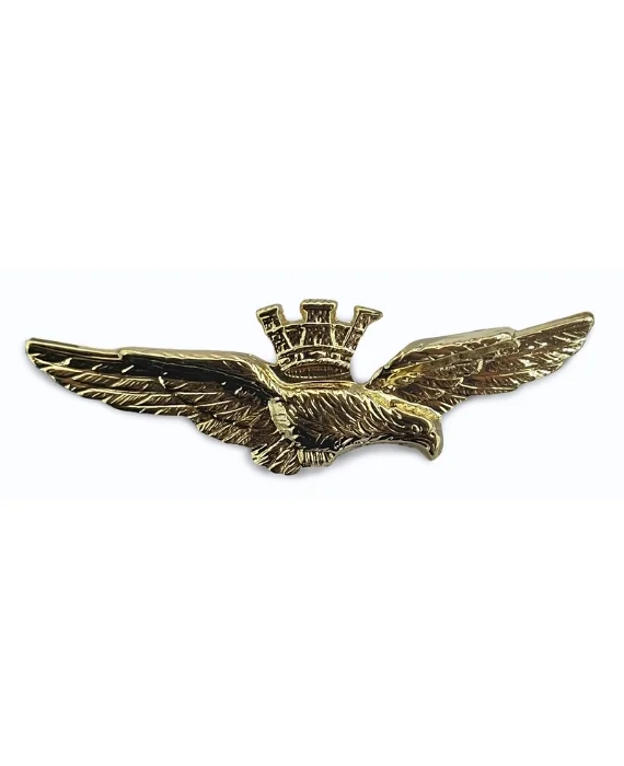 Il Brevetto Aquila Pilota Militare realizzato in puro metallo dorato si differenzia dal brevetto aquila pilota civile tramite la presenza della corona turrita.