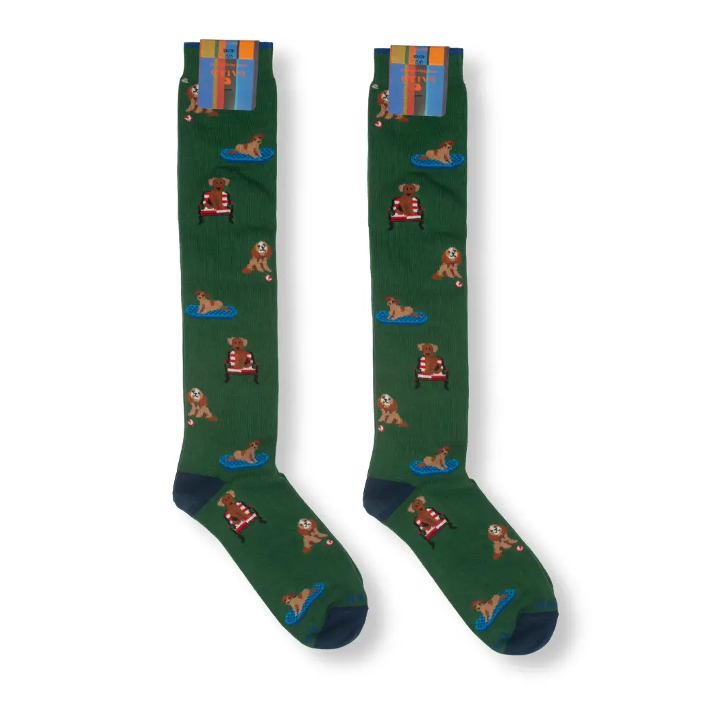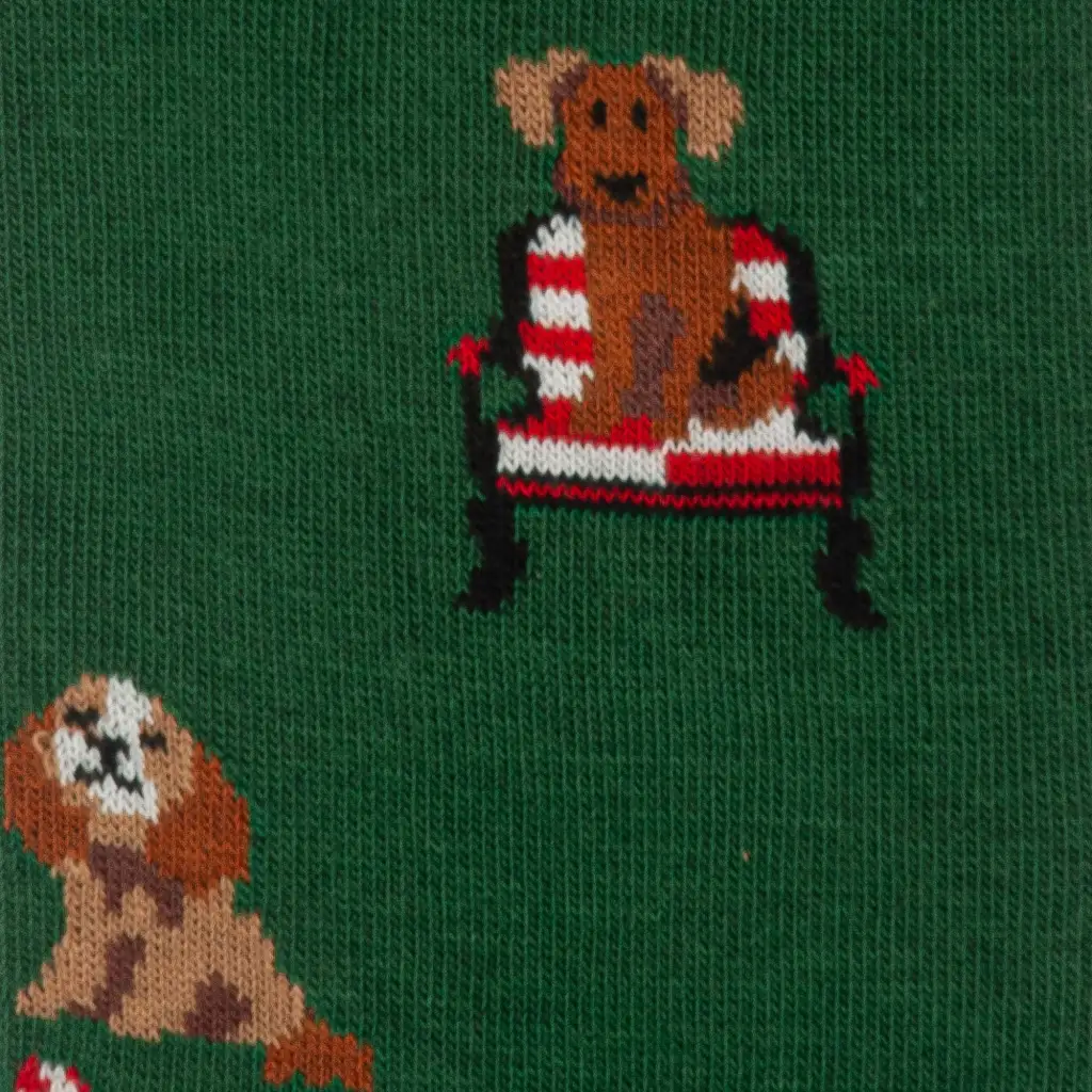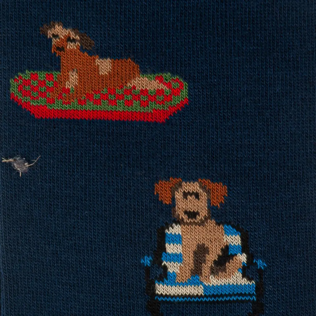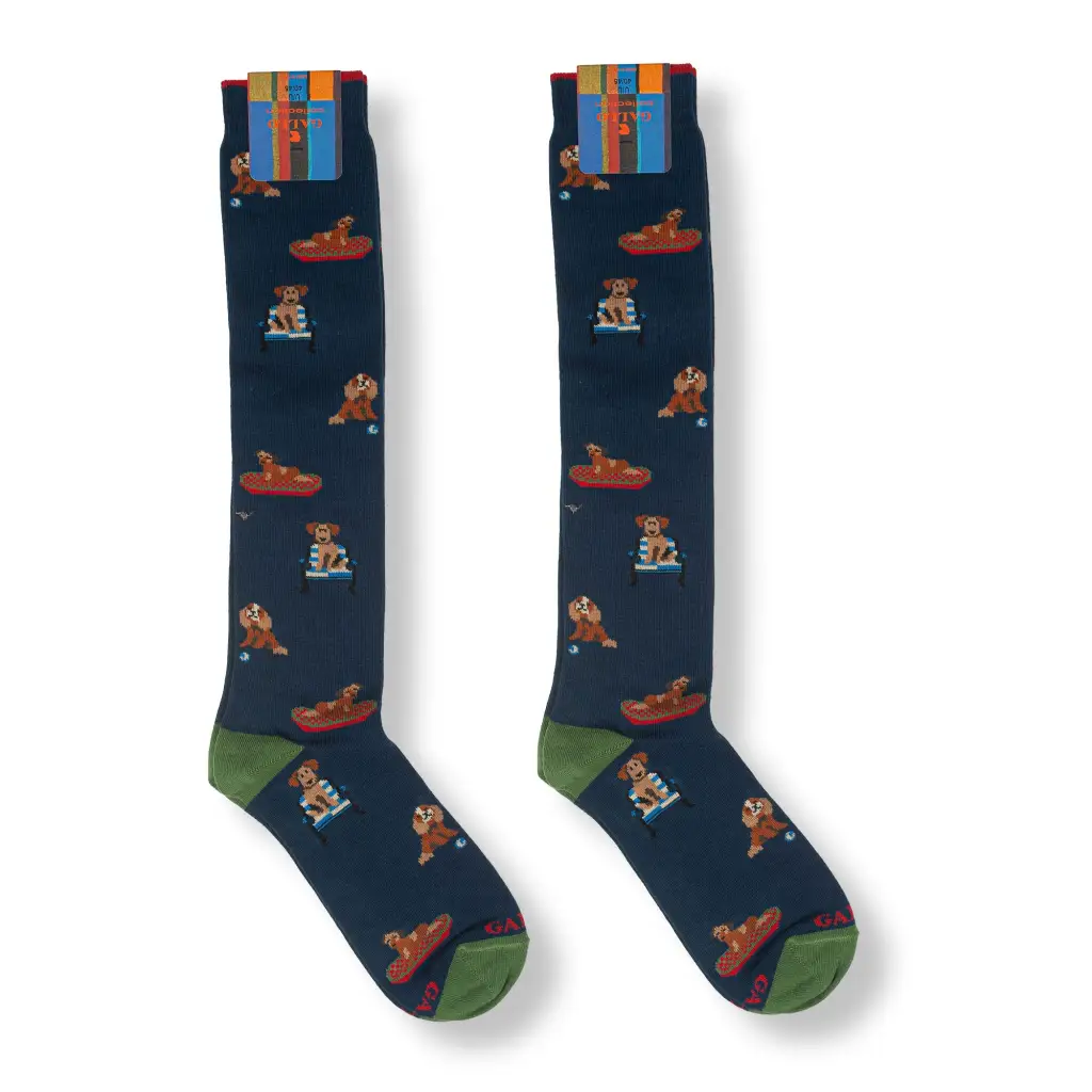 Calzino lungo in cotone in fantasia Cagnolini di Gallo. La fantasia con i cani sul calzino è moderna e particolare, con abbinamenti cromatici insoliti e molto eleganti. Rifiniscono ogni look e si adattano al meglio ad ogni occasione. I colori di fondo sono particolari e non banali, perfetti per il periodo delle feste. La punta e il tallone sono realizzati in contrasto di colore. Si consiglia di lavare ad una temperatura massima di 30°, non candeggiare e non stirare.