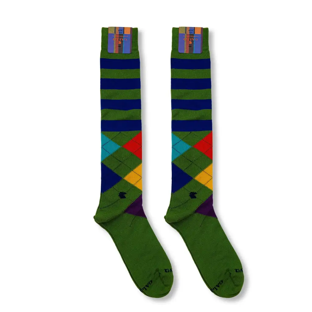 Calzino lungo da uomo realizzato in cotone leggero di Gallo. La fantasia Riga e Intarsio è molto particolare e bellissima, grazie agli abbinamenti cromatici particolari ed eccentrici. Questi calzini riescono a rifinire in modo particolare e distintivo i look più casual, ma anche a sdrammatizzare completi eleganti. La punta e il tallone sono realizzati in contrasto di colore. Si consiglia di lavare ad una temperatura massima di 30°, non candeggiare e non stirare.- Calzino lungo in fantasia Riga e Intarsio- Tessuto in cotone leggero- Made in Italy- Brand: Gallo- Riferimento articolo: AP515077-E24- Composizione: 82% Cotone, 16% Poliammide, 2% Elastan