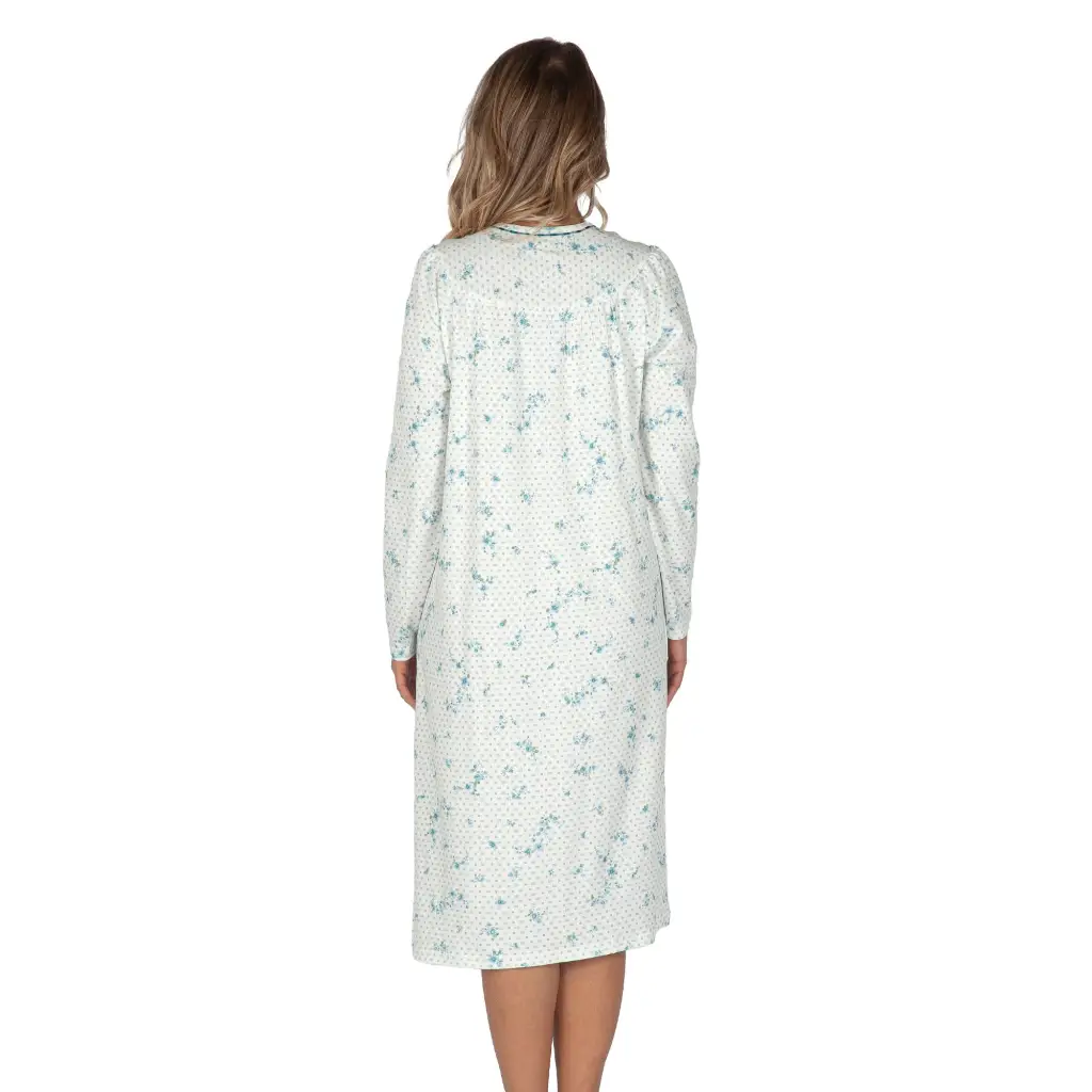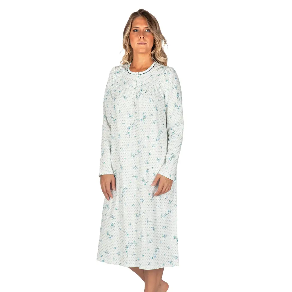 Camicia da notte a serafino a manica lunga con sprone in caldo cotone interlock di Linclalor. Questo storico brand italiano è famoso per la comodità e praticità dei modelli che crea e per la qualità dei tessuti che utilizza. Questa camicia da notte ha una fantasia classica di fiorellini azzurri tenui disegnati su un fondo bianco arricchito da piccoli quadratici colorati. Il modello è un classico intramontabile con un’ampia vestibilità. Ha lo sprone sia sul davanti che sul dietro e la manica raglan per essere ancora più confortevole e accompagnare nel migliore dei modi il riposo notturno. Il caldo cotone Interlock è morbido e dona tepore per conciliare il riposo. La profonda apertura a serafino è molto pratica e facilita l’indosso.