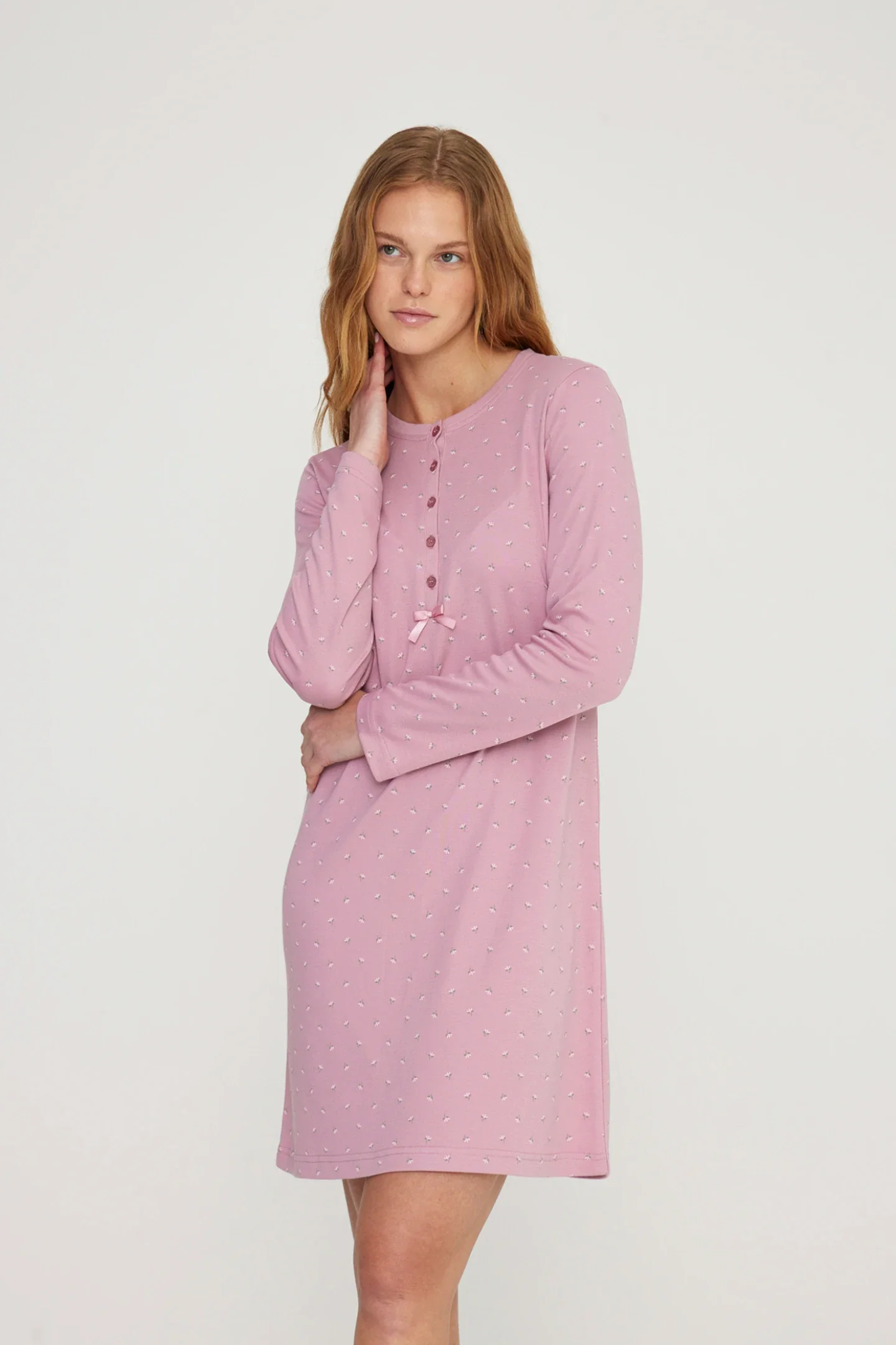 Camicia da notte donna tuly in morbido caldo cotone con collo cinque bottoni e dettaglio fiocco in romantica stampa a fiori