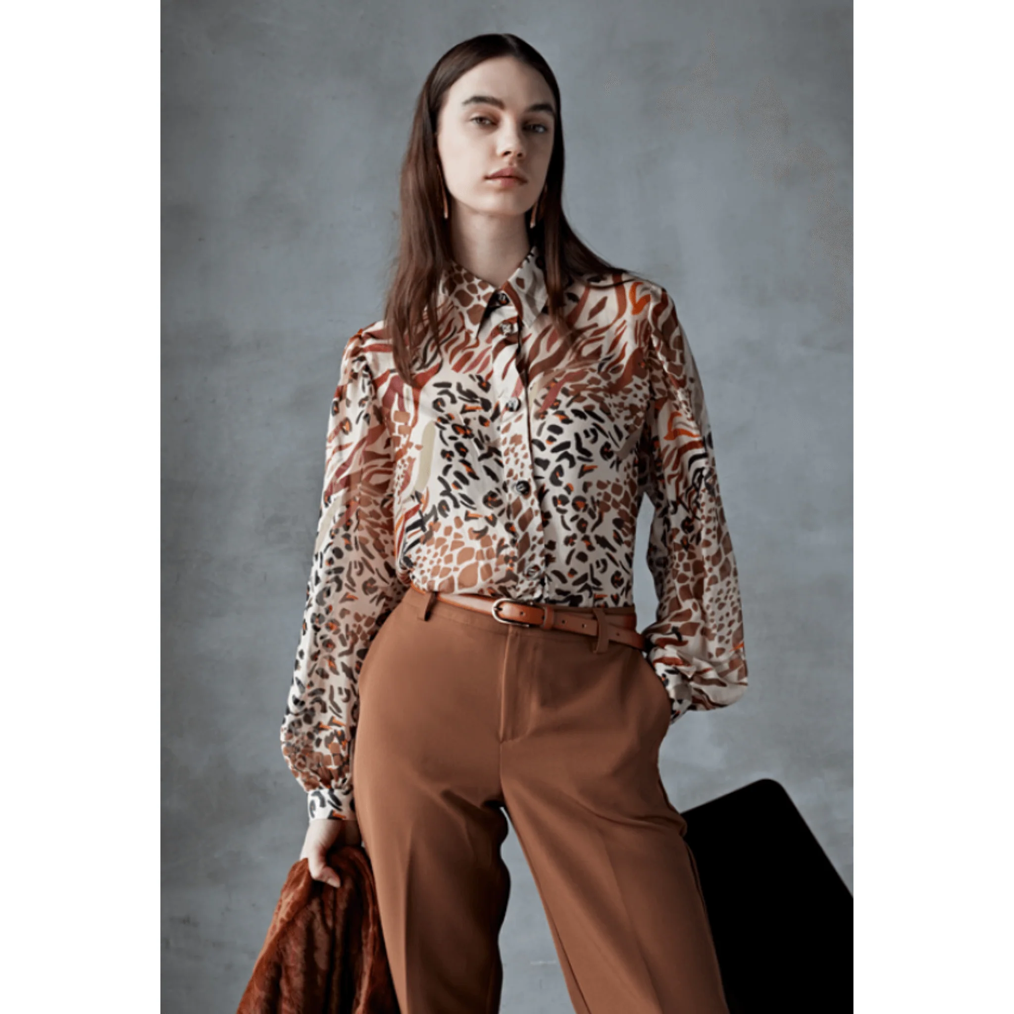 Camicia donna a fantasia animalier unisce un design elegante a materiali di alta qualità, realizzata con il 70% viscosa e 30% seta per garantire morbidezza e traspirabilità. Le maniche lunghe offrono versatilità, rendendola ideale per un look sofisticato in ogni stagione. Perfetta per chi cerca un capo raffinato con una stampa audace e contemporanea.