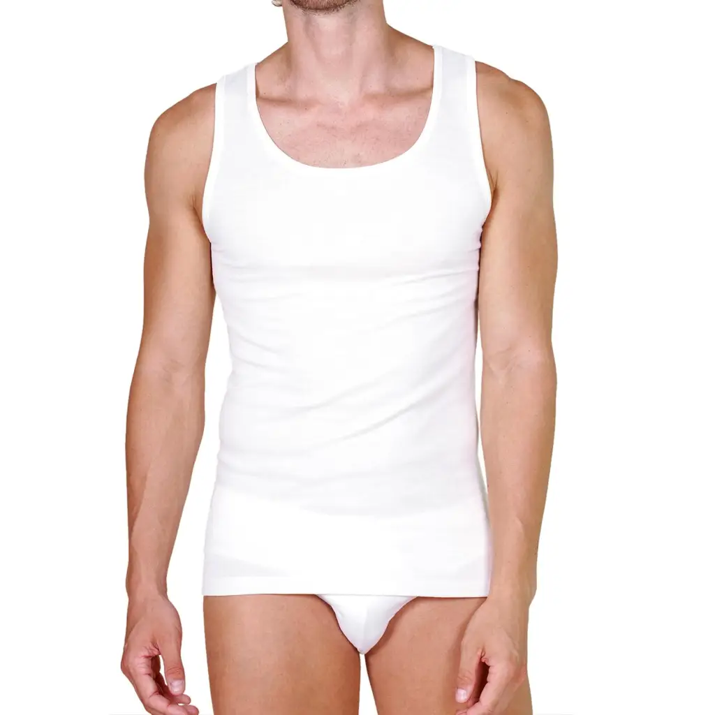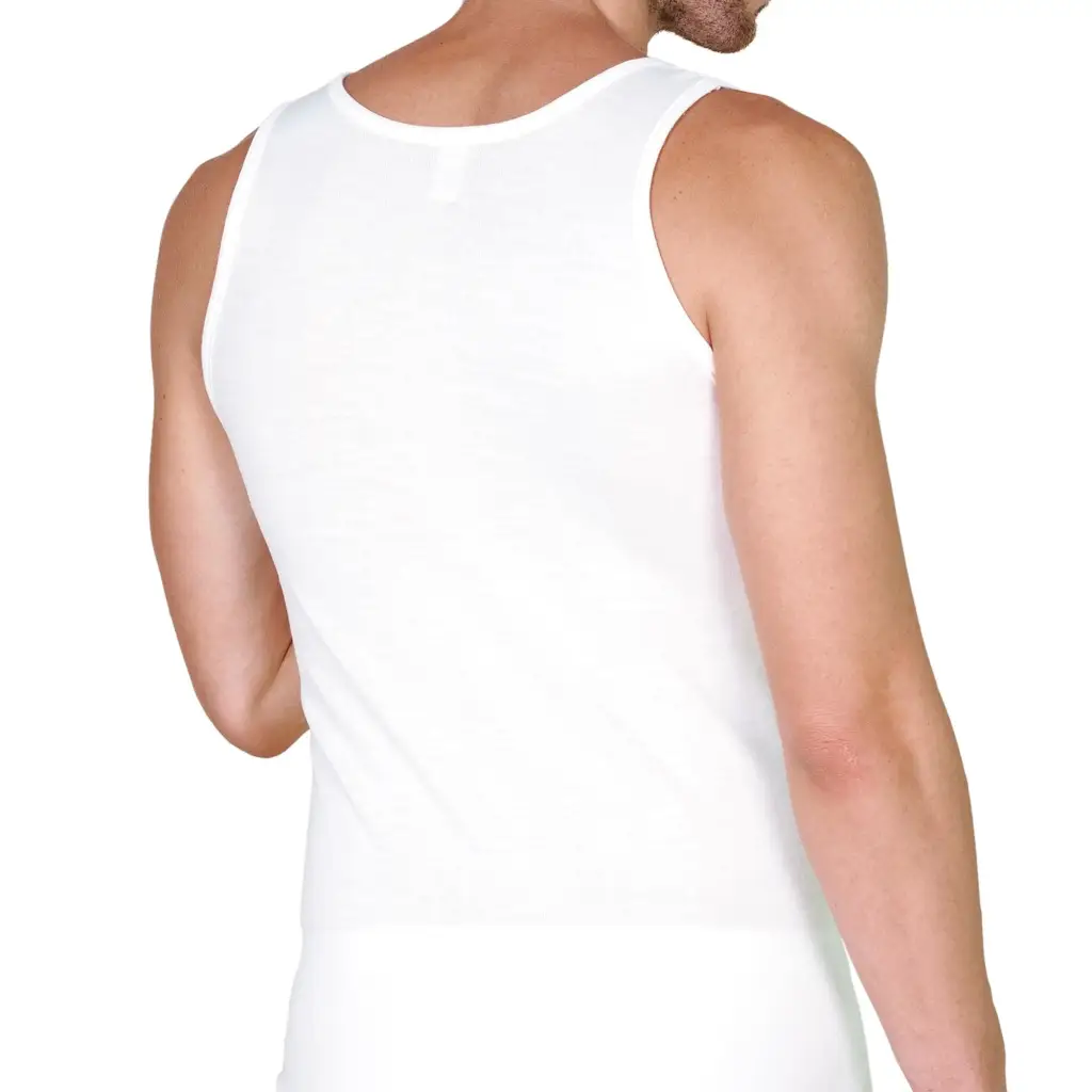 Canottiera uomo paricollo a spalla larga in lana e cotone sulla pelle di Mariotti Lab
