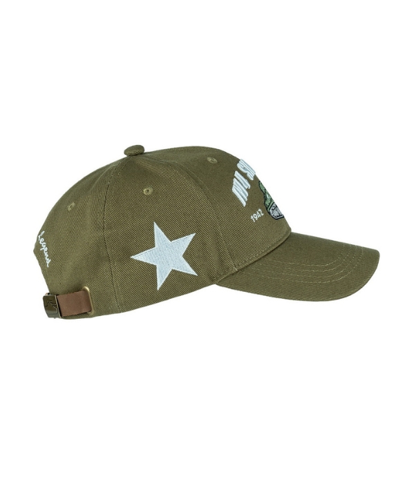 Realizzato in robusto cotone verde militare, il cappello presenta sul frontale un ricamo dettagliato del tank M4 con le date 1942–1945, simbolo di forza e determinazione.