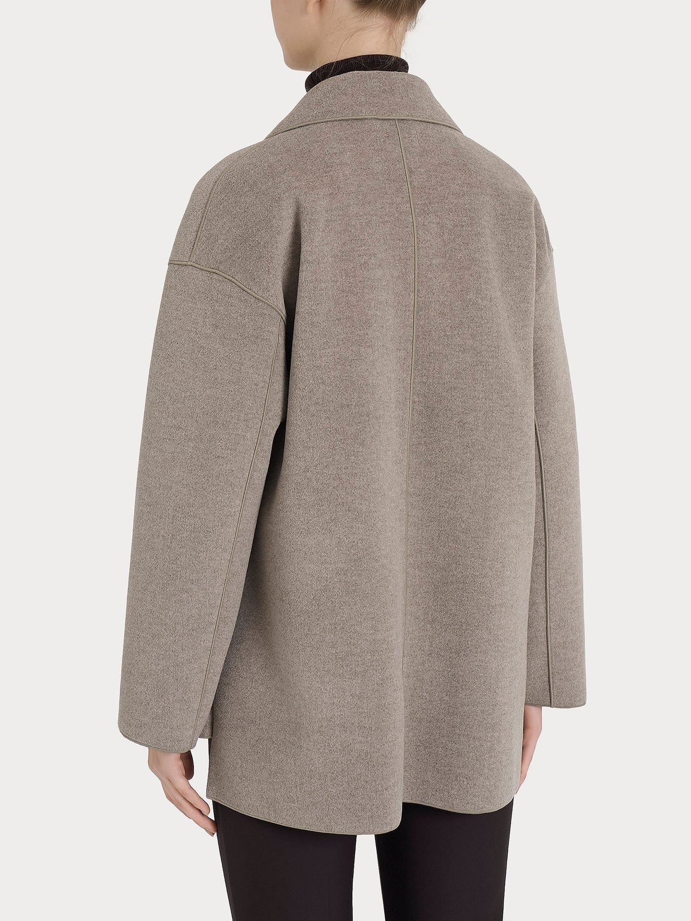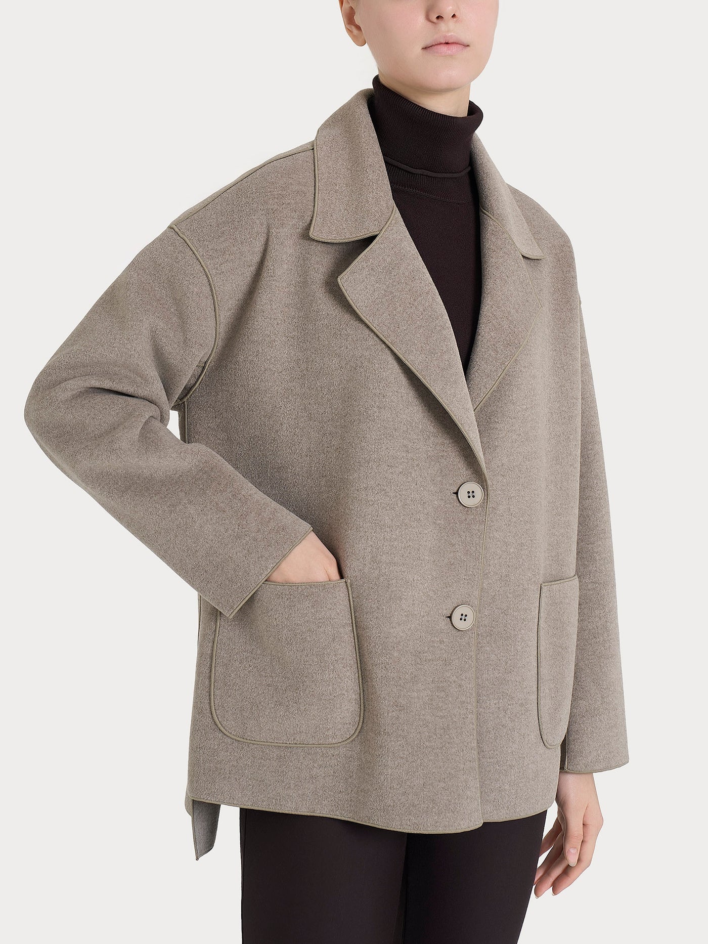 Cappotto caban da donna in Vegan Wool. Caratterizzato dallo scollo con rever, dalla chiusura frontale a due bottoni e da due tasche applicate che donano praticitร al capo. Classico e contemporaneo allo stesso tempo, il cappotto caban in vegan wool รจ una scelta di stile consapevole che unisce eleganza, comfort e sostenibilitร . Con spacchetti laterali e il dietro piรน lungo del davanti รจ pratico da indossare sopra tutti i capi. Realizzato in vegan wool, unโalternativa etica alla lana tradizionale, garantisce calore, morbidezza e resistenza, offrendo una texture piacevole al tatto e un look raffinato.