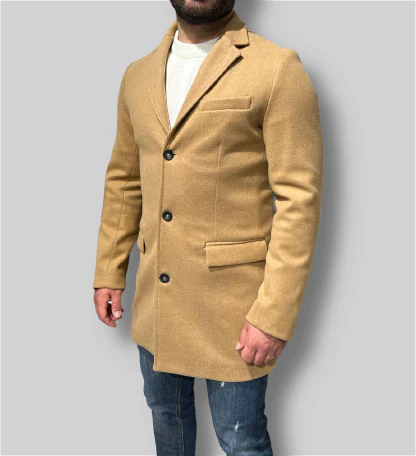 Elegante cappotto uomo Myden, realizzato con una raffinata miscela di poliestere e lana, offre un look sofisticato ed esclusivo in tinte classiche nero e cammello. Perfetta armonia di linee semplici ed essenziali, con tre bottoni neri ed eleganti, questo cappotto sartoriale si presenta come un vero gioiello della moda maschile. Codice articolo GCP597
