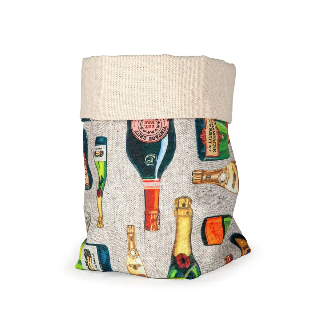 Cestino porta pane in cotone e tessuto antimacchia in fantasia Champagne di Zita del Forte. Questi prodotti sono tutti confezionati in Toscana ed esaltano al meglio il gusto della tradizione toscana e dell’estetica. Il porta pane a cestino è realizzato con fodera interna in 100% Cotone e tessuto esterno antimacchia in fantasia con stampe ad alta definizione. La linea Lorenza con le bottiglie di Champagne deve il proprio nome ad una celebre sommelier del nostro Paese e si presenta elegante ma allo stesso tempo moderna, con il suo fondo in grigio, molto particolare. Il tessuto antimacchia e antipiega è caratterizzato da una mano setosa e morbida che, grazie all’intreccio delle fibre, non necessita di stiratura. Per il corretto mantenimento del cestino porta pane si consiglia un lavaggio a massimo 30° e l’asciugatura naturale all’aria.