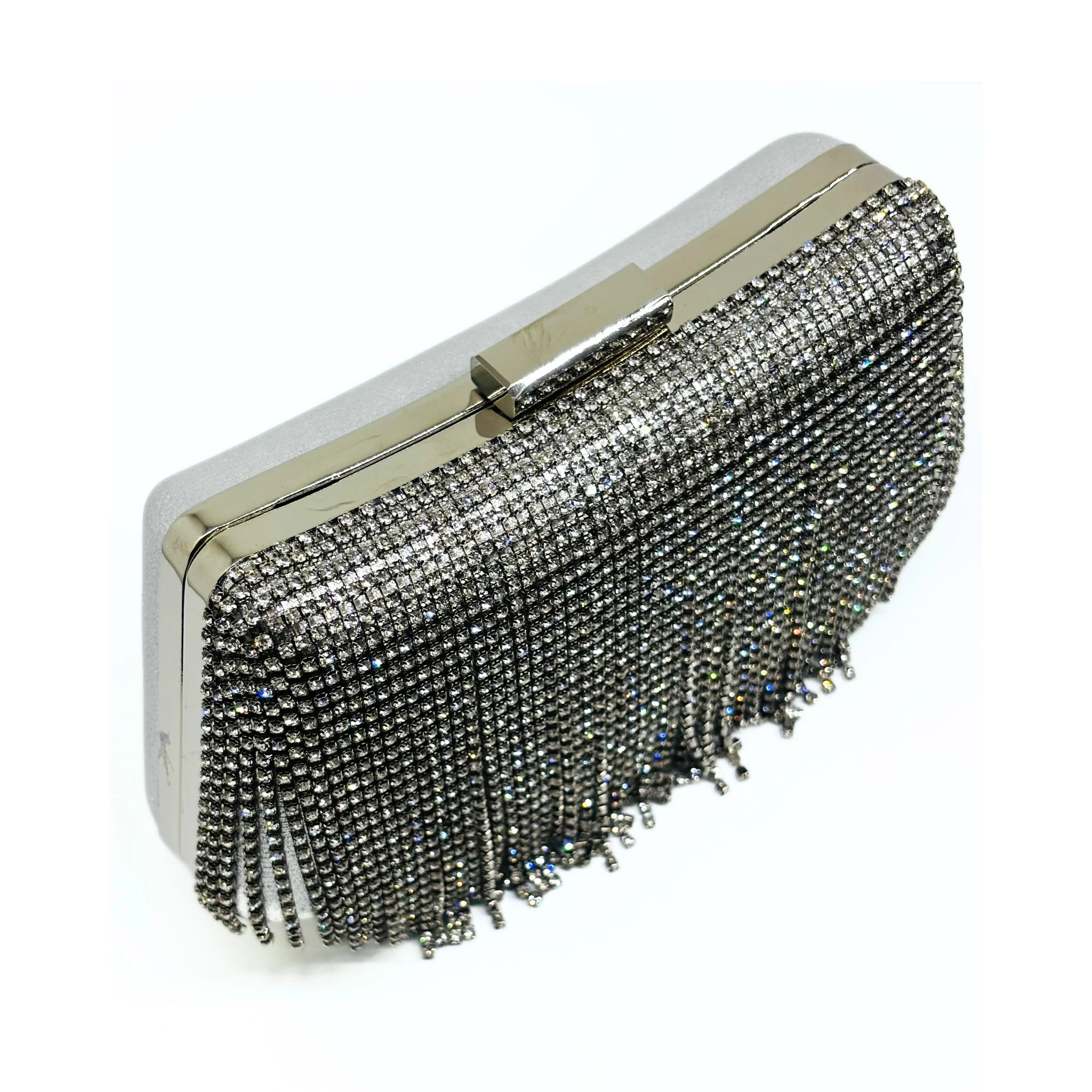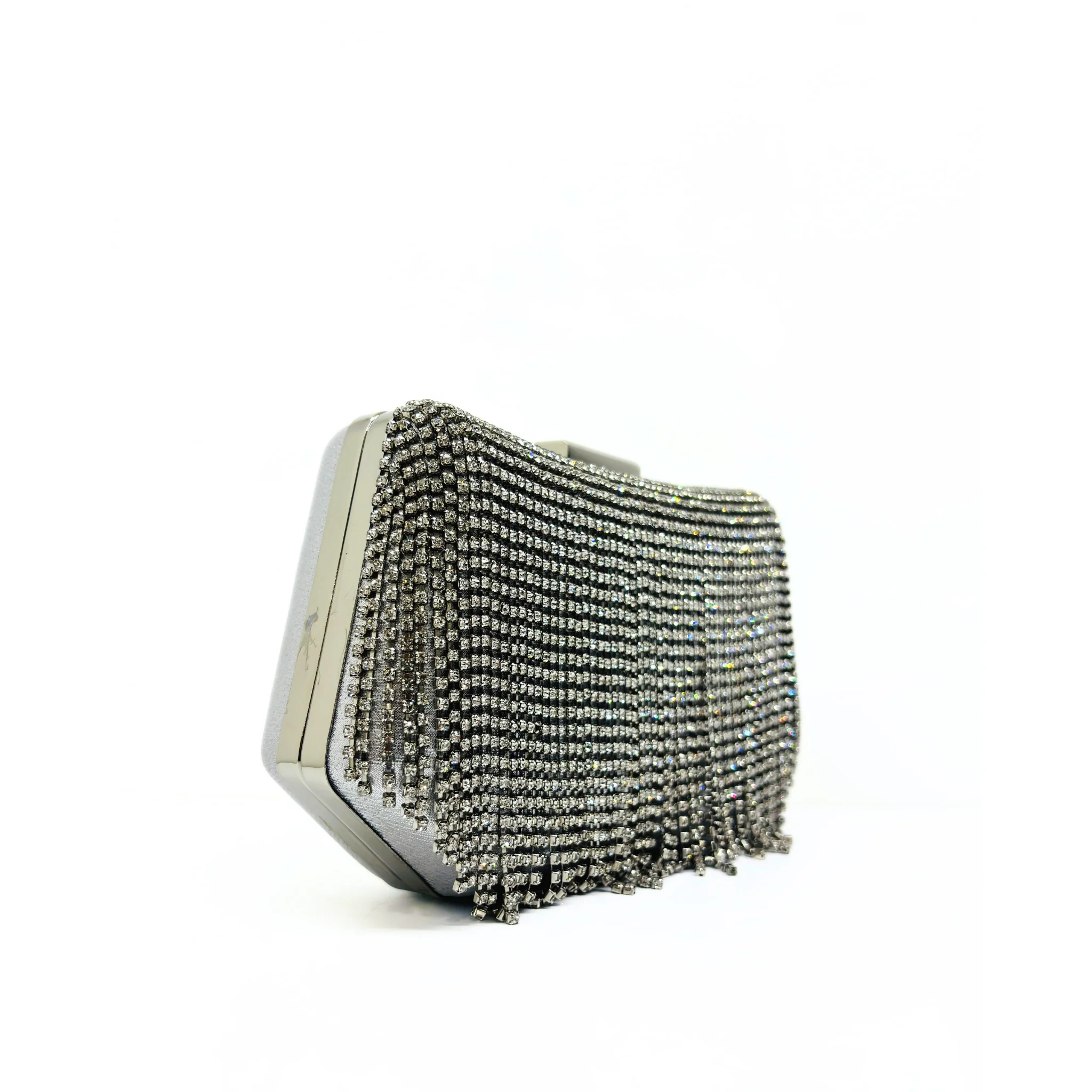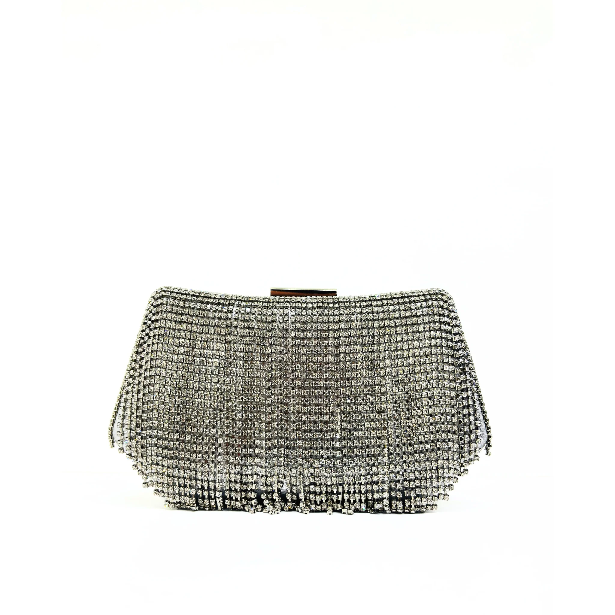 Clutch laminata con frange ha uno stile elegante e moderno. La catena removibile offre versatilità e praticità, mentre le dimensioni di 19 x 12 x 6 la rendono perfetta per contenere tutti i tuoi oggetti essenziali. Un accessorio chic per ogni occasione.