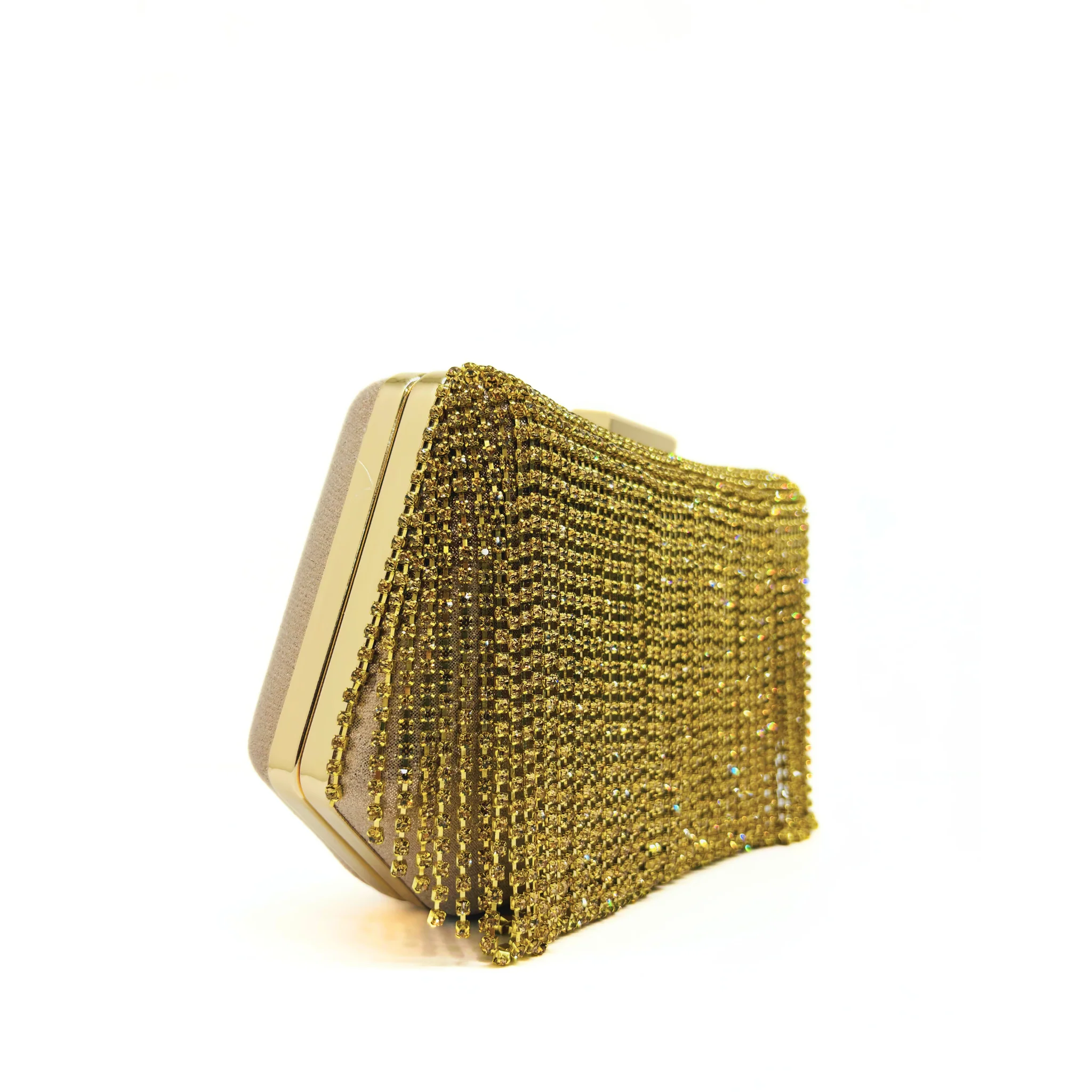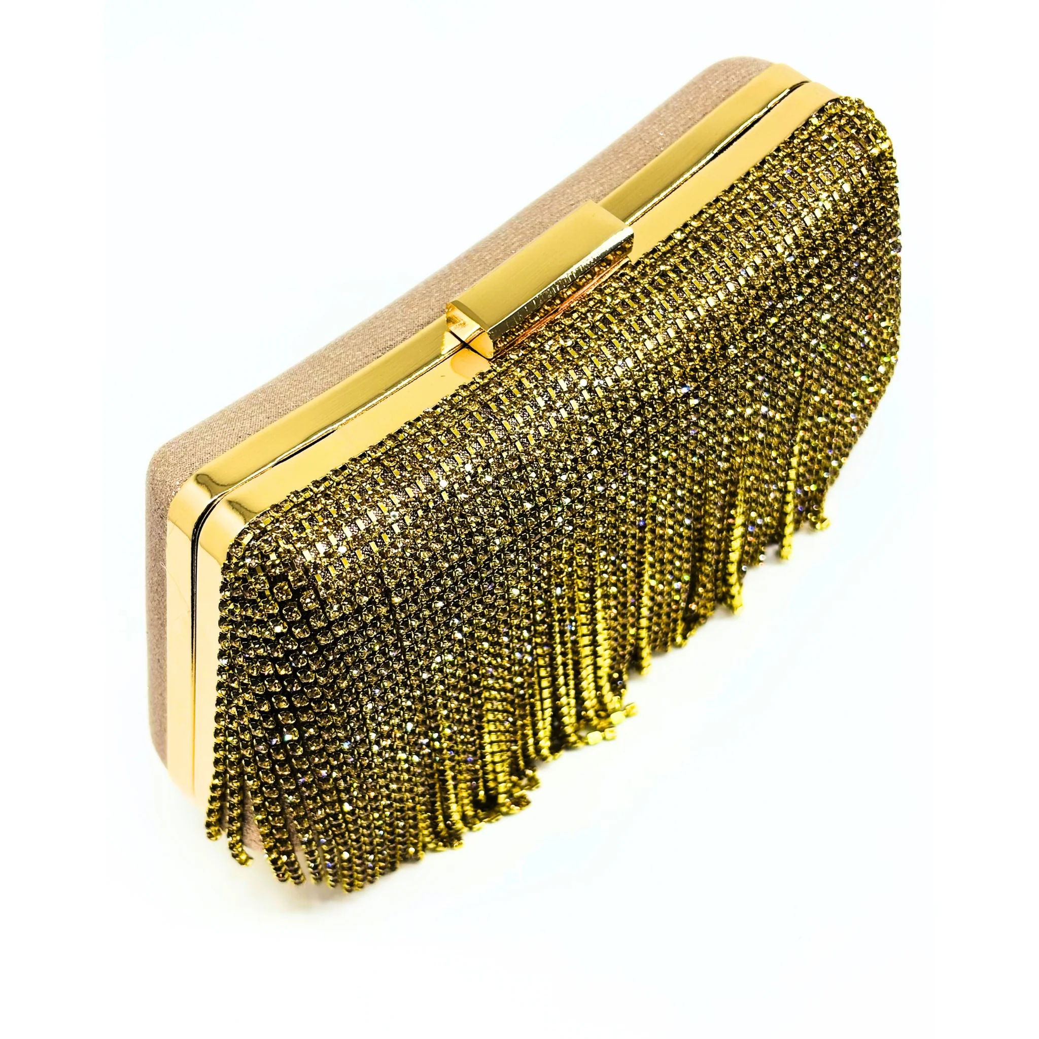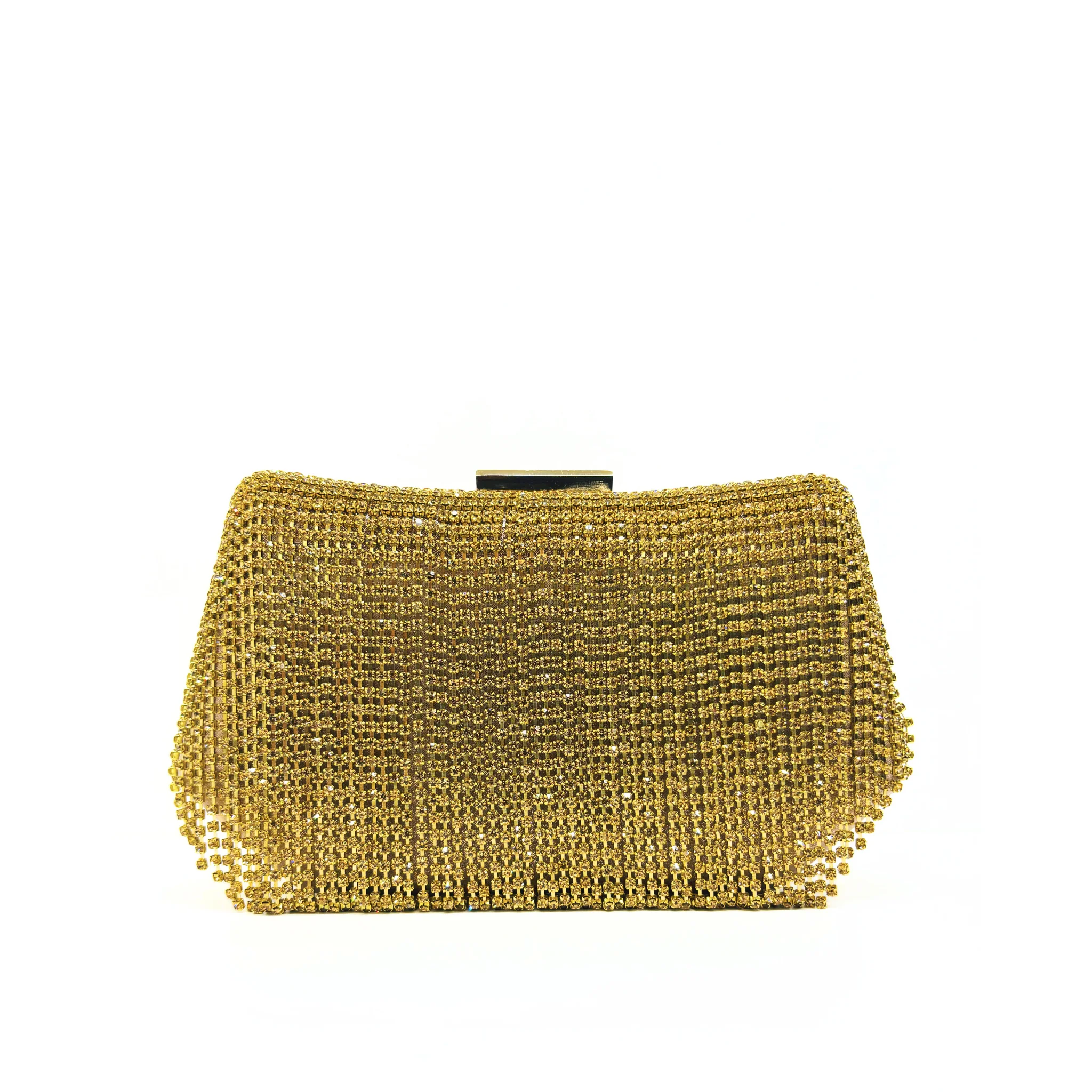 Clutch laminata con frange ha uno stile elegante e moderno. La catena removibile offre versatilità e praticità, mentre le dimensioni di 19 x 12 x 6 la rendono perfetta per contenere tutti i tuoi oggetti essenziali. Un accessorio chic per ogni occasione.