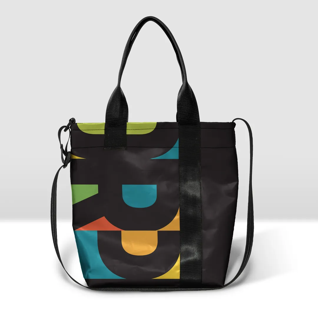 Borsa in banner PVC stampato, con zip pressofusa divisibile e tasca interna.