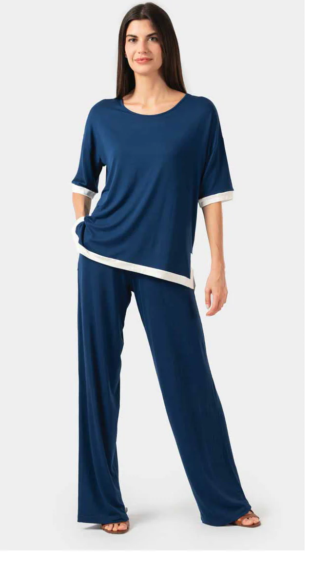 Completo donna adatto ad ogni occasione, composto da una maglietta con manica 3/4 abbinata ad un pantalone a palazzo, un completo morbido eleganze ma anche fresco, adatto per una giornata in ufficio ma anche ad una serata romantica, in totale viscosa.