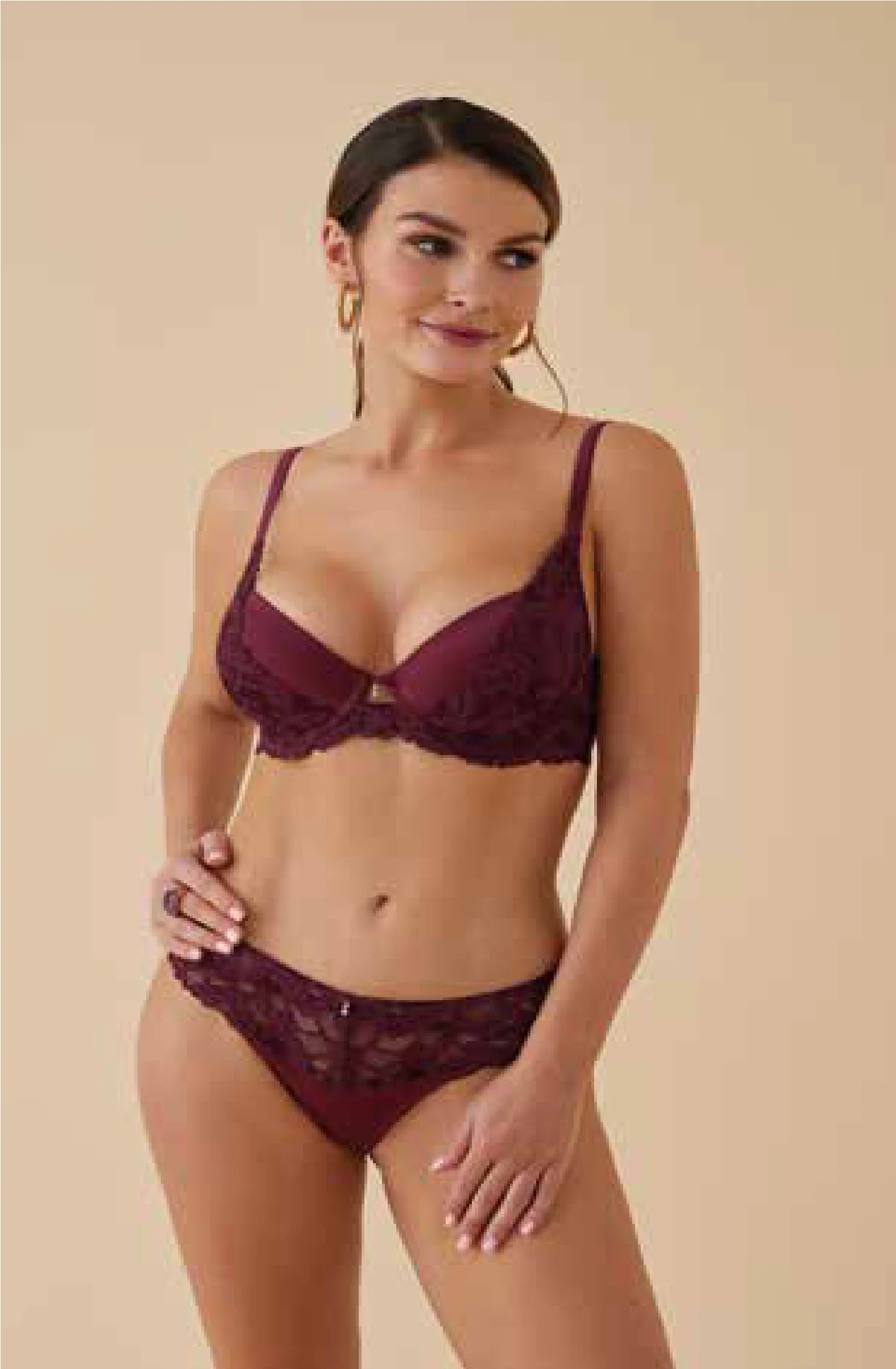 Completo donna con push up con ferretto in pizzo bordeaux abbinato a mutanda slip con pizzo bordeaux: COD.REGG L6561 (โฌ44,00) CON COD.SLIP: L6572 (โฌ24,00)