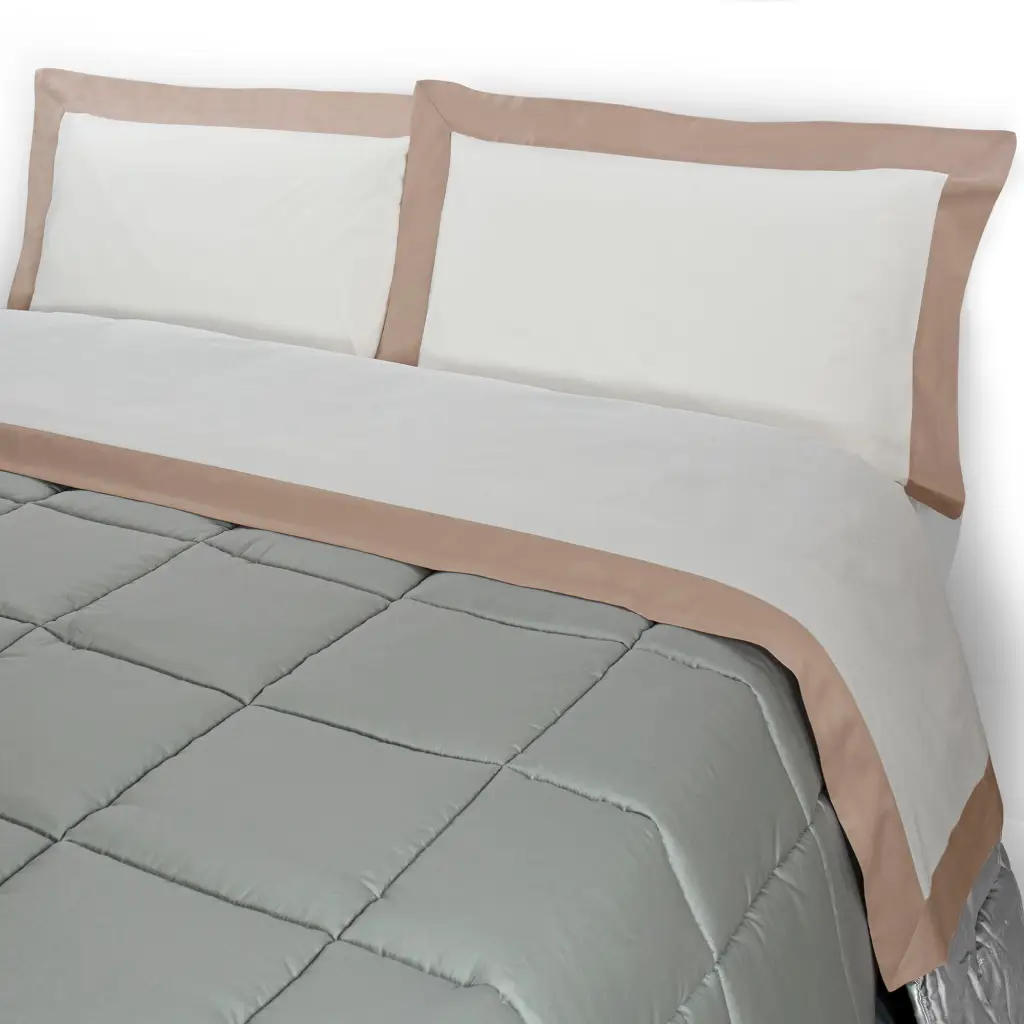- Il lenzuolo sopra รจ interamente in color panna in puro cotone, con una elegante balza colorata in raso di cotone che crea anche giochi di brillante opaco con il lenzuolo