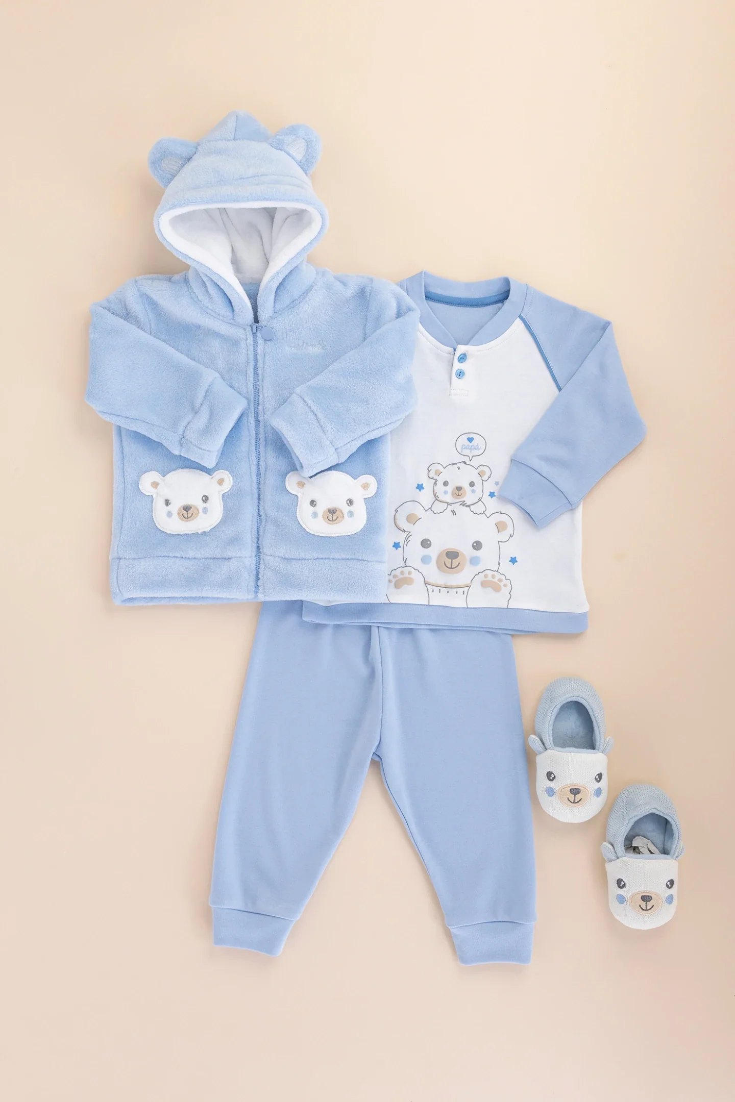 completo neonato Completo 3 pezzi neonato coral e caldo cotone marcolino top manica lunga azzurro con collo serafino e stampa centrale e pantalone azzurro con polsini in caldo cotone giacca con tasche sul davanti con applicazione e chiusura zip in coral COD. FT760AS