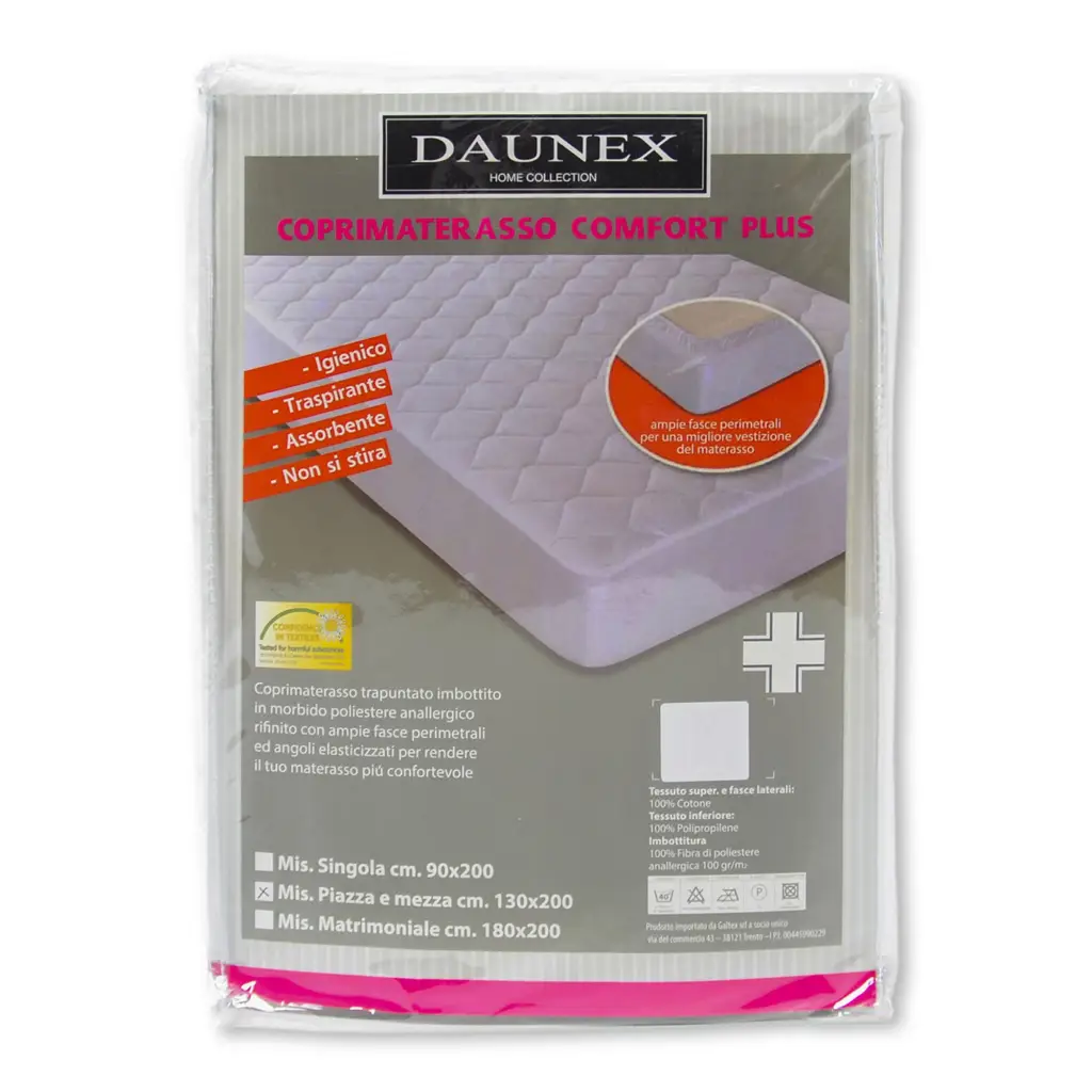Coprimaterasso imbottito con fasce perimetrali e angoli della linea Comfort Plus di Daunex. Questo particolare coprimaterasso è trapuntato e imbottito nella parte superiore per donare ancora più comodità e morbidezza al materasso. Con fasce perimetrali alte ad angoli elasticizzati, è facile da sistemare sul materasso e ne assicura una perfetta vestibilità. L’imbottitura interna è in morbido poliestere anallergico per garantire il massimo del comfort.