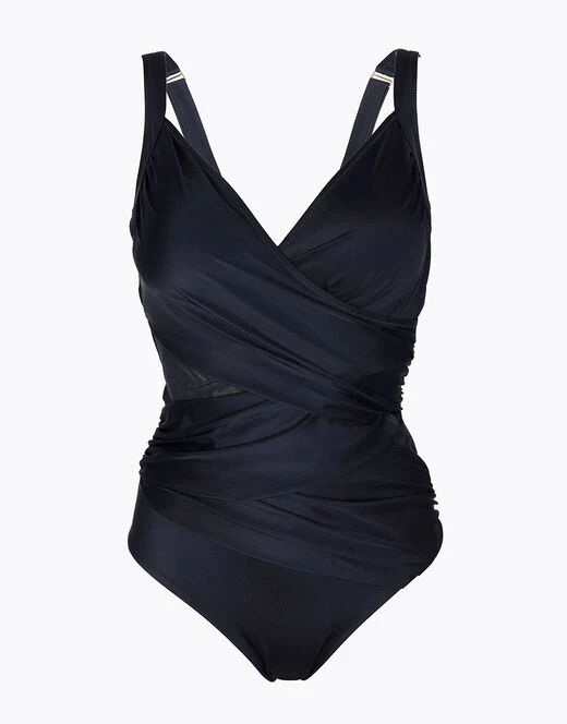 Il gioco di drappeggi sul davanti, combinato con spazi di leggera trasparenza creati dal tulle tecnico, aggiunge un tocco di eleganza e raffinatezza al design, creando un effetto visivo di leggerezza e sensualitร . L’elastico sotto seno e le coppette fisse offrono un sostegno ottimale, garantendo comfort e supporto durante l’intera giornata.