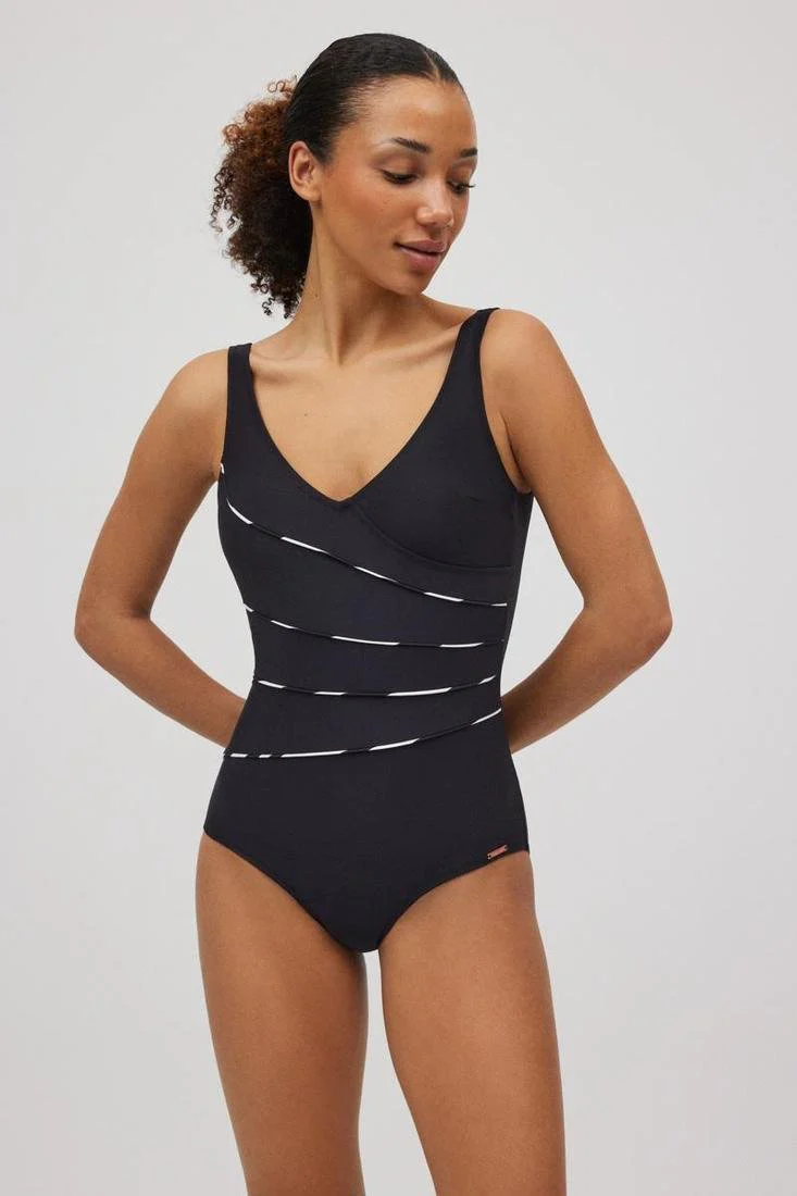 Costume intero da donna modellante , color nero con dettagli bianchi sul ventre.