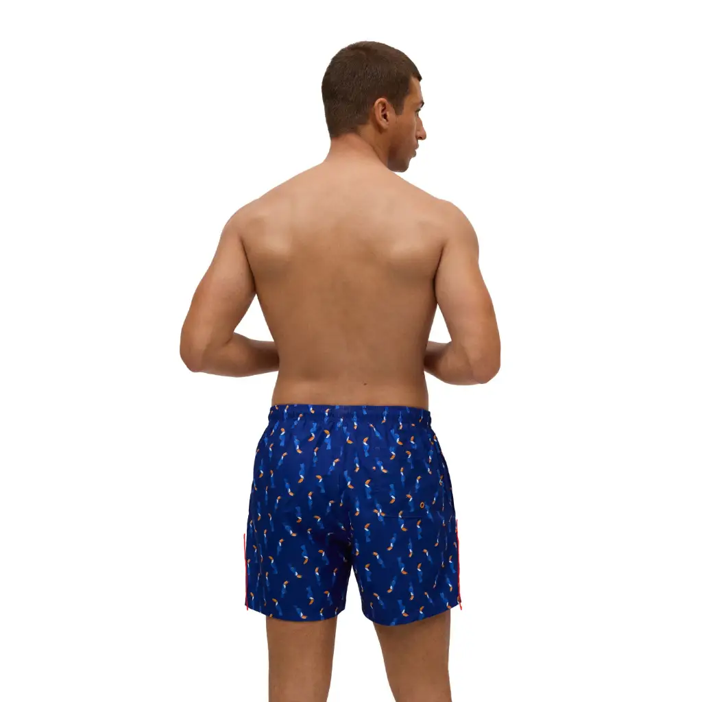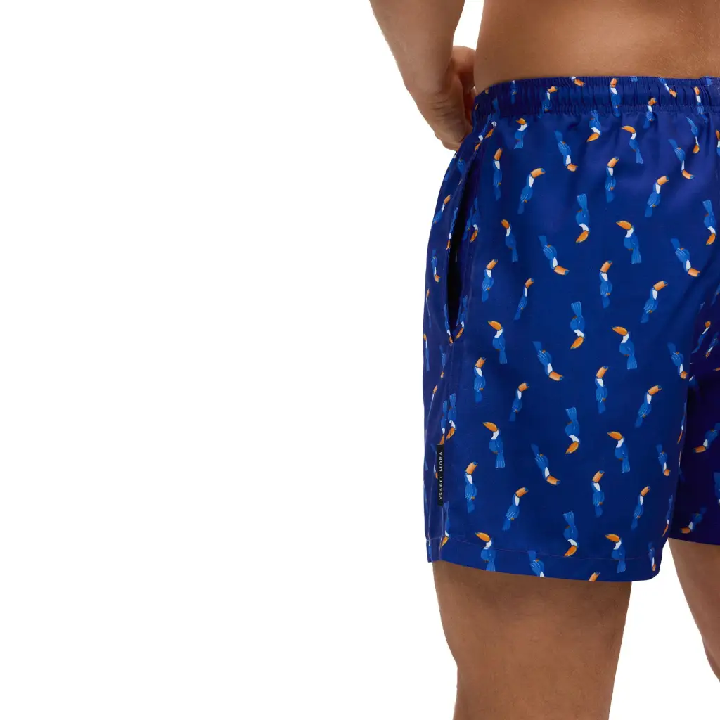 Costume a pantaloncino in fantasia Tucano di Ysabel Mora. Questo brand spagnolo è famoso per i suoi design divertenti ma comunque portabili. Questo costume ha la coulisse in vita e due comode tasche laterali, oltre che una tasca sul dietro con chiusura con velcro. La fantasia Tucano è sobria ed elegante con un fondo Blu Cobalto molto particolare e brillante.