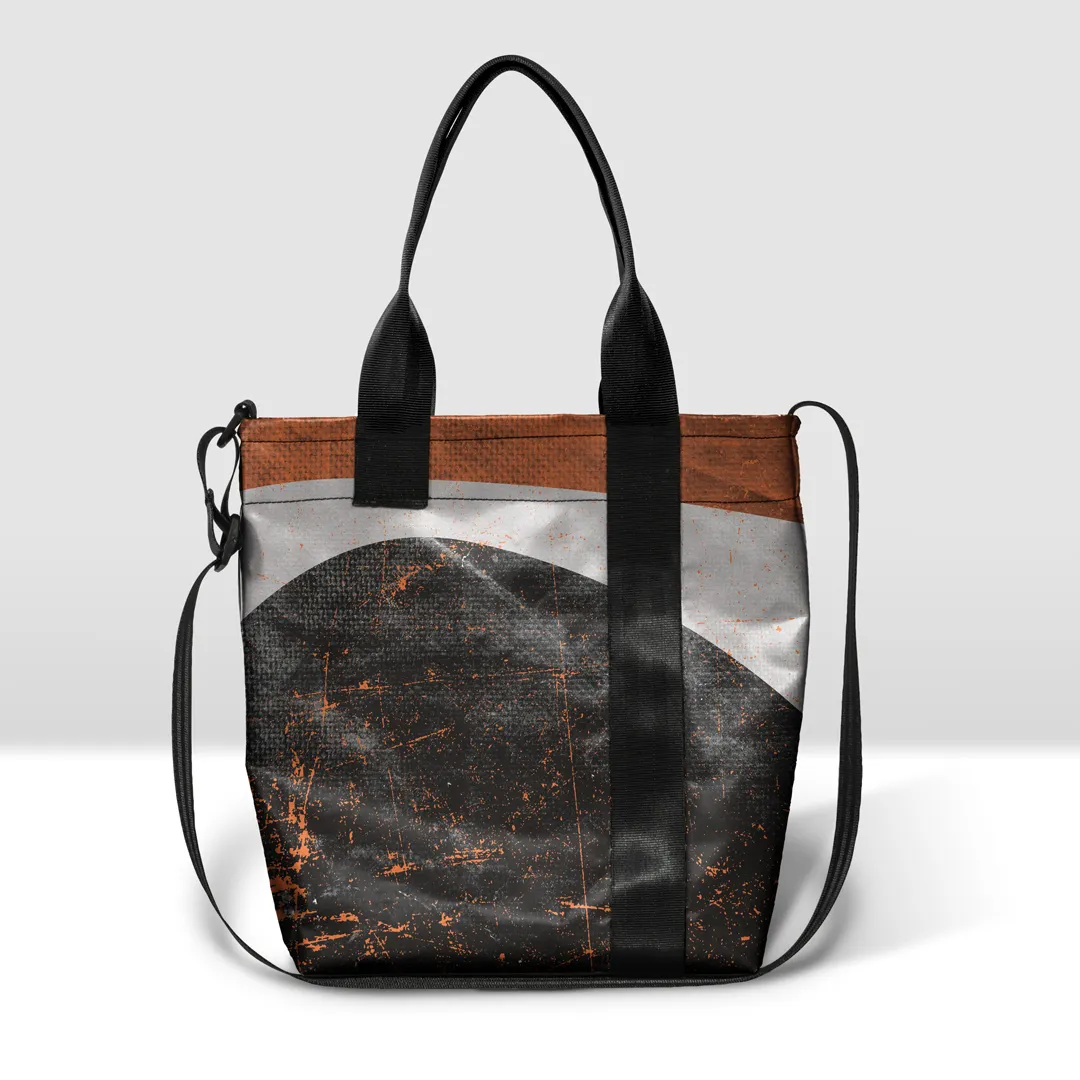 Borsa in banner PVC stampato, con zip pressofusa divisibile e tasca interna.