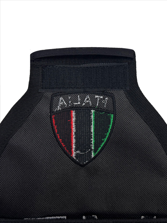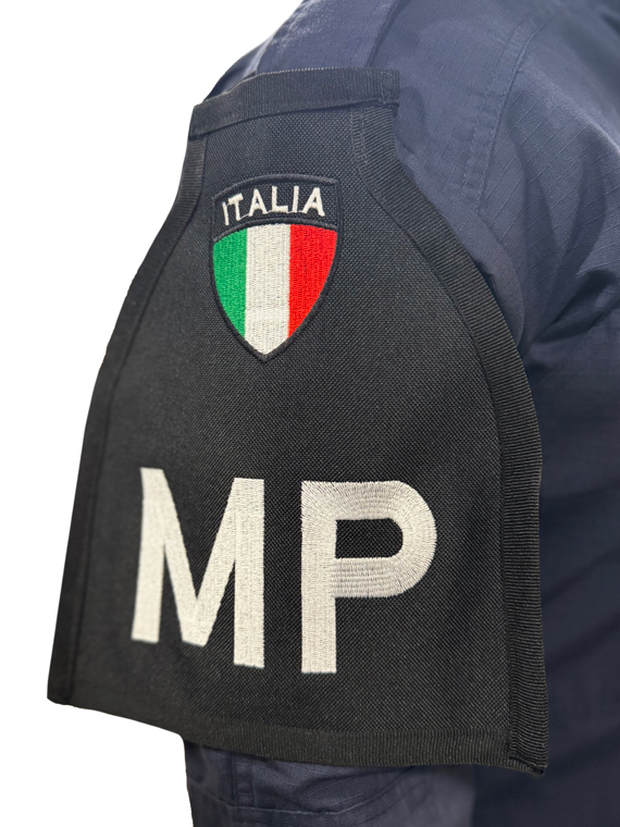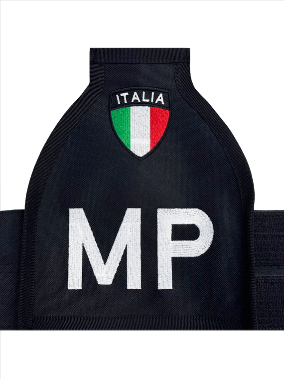 Realizzata in tessuto ricamato di alta qualità, questa fascia presenta una base nera con la scritta “MP” ricamata e Scudetto Italia.