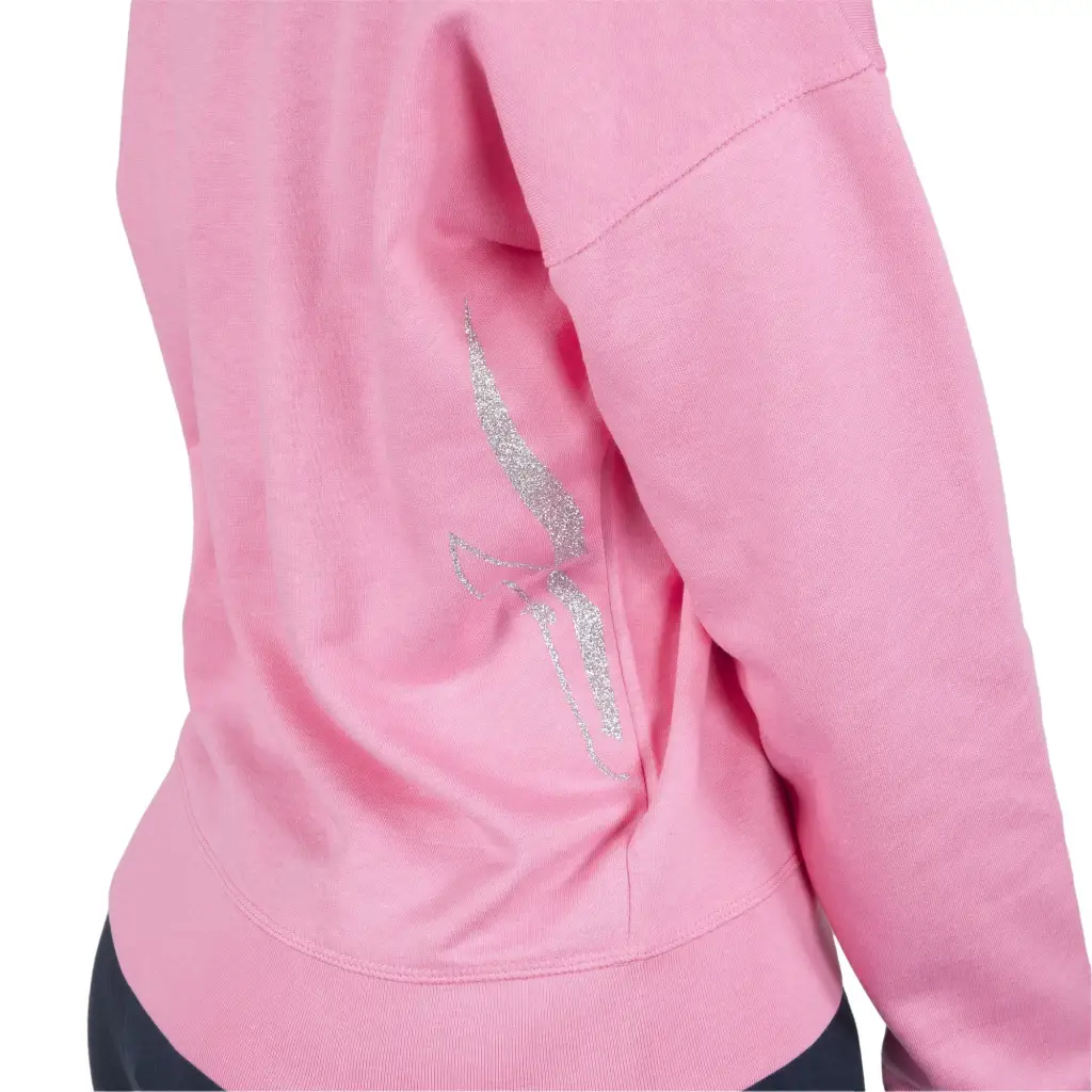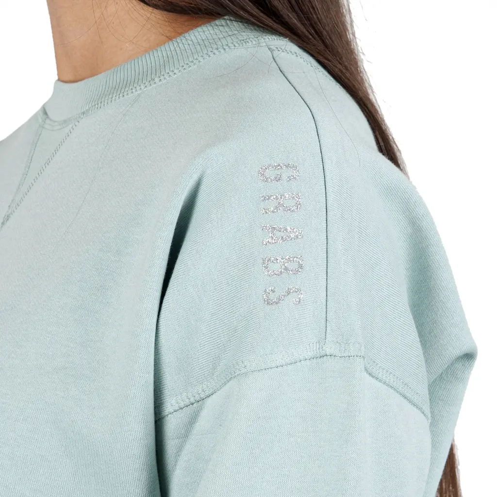 Felpa paricollo con taglio oversize in cotone biologico felpato di Grabs. Questo brand si prefigge una moda sostenibile non solo nella produzione, ma anche per durevolezza dei capi, che quindi possono essere utilizzati a lungo. Questa felpa è molto versatile e confortevole, grazie al taglio oversize morbido. La stampa glitterata in contrasto è particolare e vivace e dona un tocco femminile all’intero look. Il modello presenta un elastico a costina alle maniche e impunture piatte a vista per un tocco ancora più sporty-chic. Si può abbinare sia a pantaloni casual o jeans che a pantaloni modello tuta. Il tessuto dell’intera felpa è un misto di cotone biologico e Modal, morbidissimi, da 280 gr/mq.