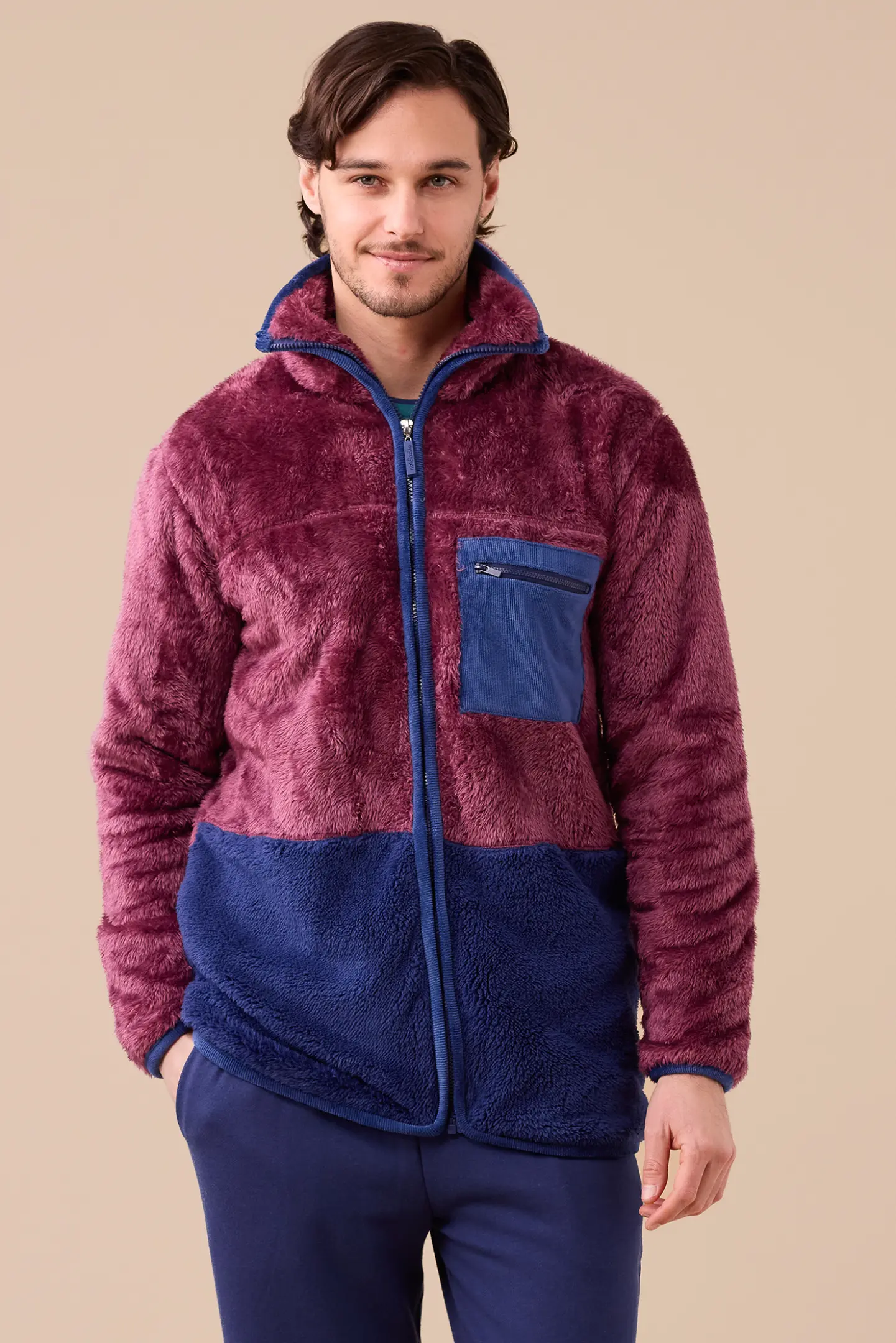 Giacca uomo in eco-pelliccia bicolore blu e bordeaux, con collo alto e zip