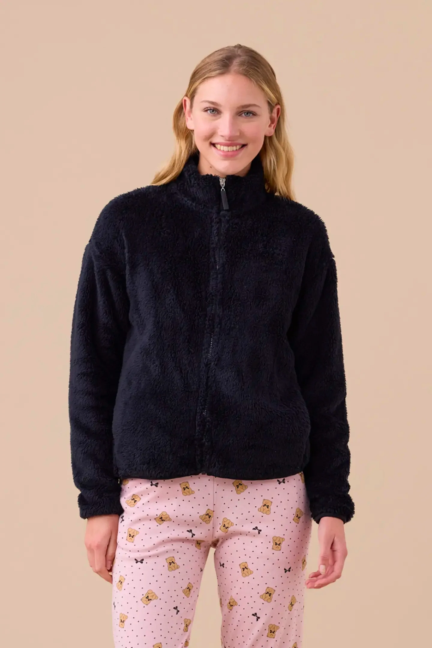 Giacca donna in eco pelliccia senza cappuccio e con cerniera.
